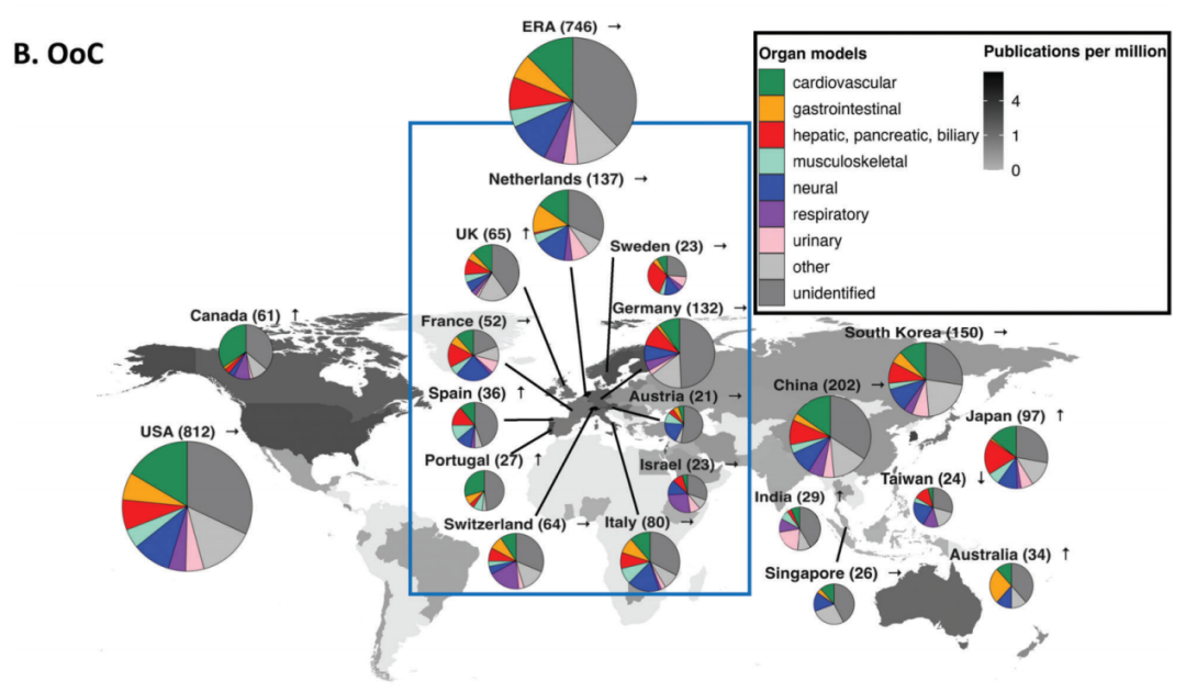 器官芯片技术方面,也取得了一定的进展。清华大学和大连化物所从事微流控研究的团队最早将微流控芯片推进到类器官/器官芯片研究。2002年,由大连理工大学王立鼎院士、东北大学方肇伦院士和清华大学罗国安教授牵头,在北京召开首届全国微全分析系统会议,开启了中国微流控芯片元年。2011年,大连理工大学微流控芯片药学研究团队成立,开始器官芯片研究。2019年,科技部首批变革性技术关键科学问题重点研发计划项目(人体器官芯片的精准介观测量)立项。同样,中国在器官芯片领域研究成果占比排名全球第三位。