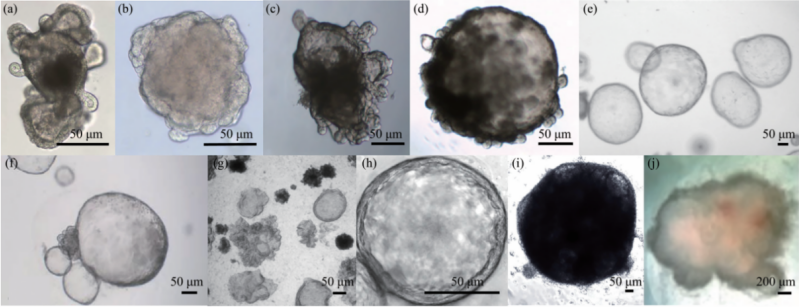 图注:(a)小肠类器官形貌图.(b)结肠类器官形貌图. (c)食管类器官形貌图.(d)胃类器官形貌图. (e)肝脏类器官形貌图.(f)胰腺类器官形貌图.(g)肺类器官形貌图.(h)乳腺类器官形貌图. (i)肾类器官形貌图.(j)脑类器官形貌图