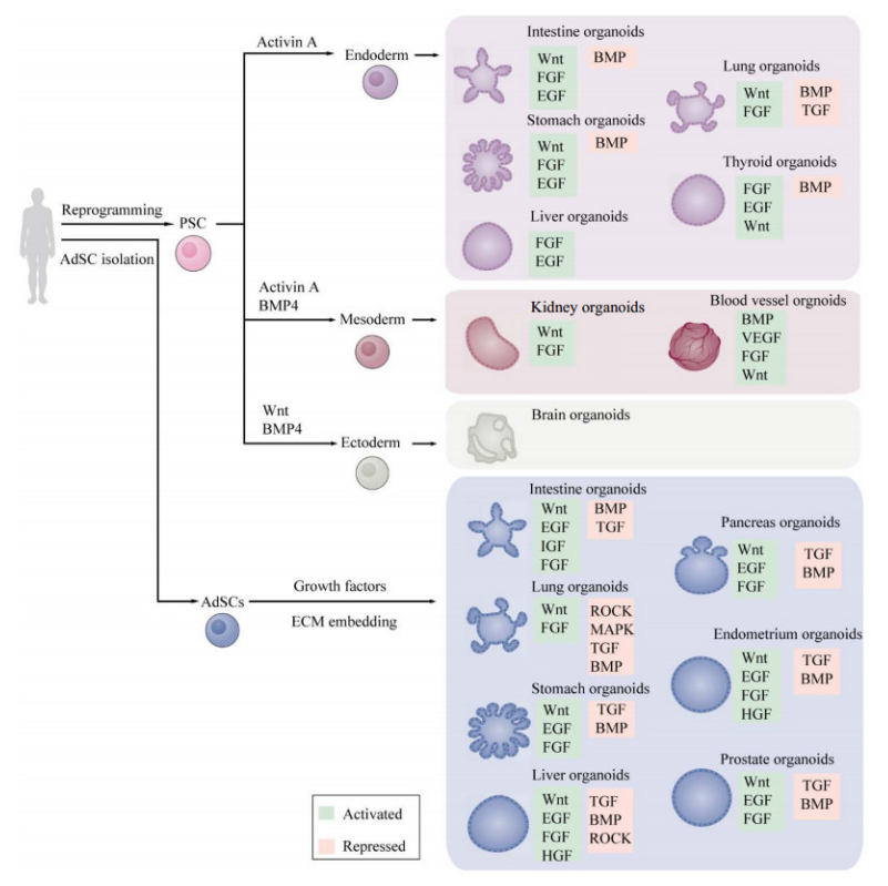 多能干细胞PSC具有无限自我更新并分化为几乎所有器官特异性的细胞类型,其中胚胎干细胞ESC来源于囊胚期内细胞团的全能干细胞,因其应用涉及到伦理问题导致其使用受限。成体干细胞ASC通常来源于患者的活检组织,但其分化能力有限,而且ASC类器官一般仅含有器官的上皮部分,缺乏基质、神经和血管系统,培养体系相对比较简单。