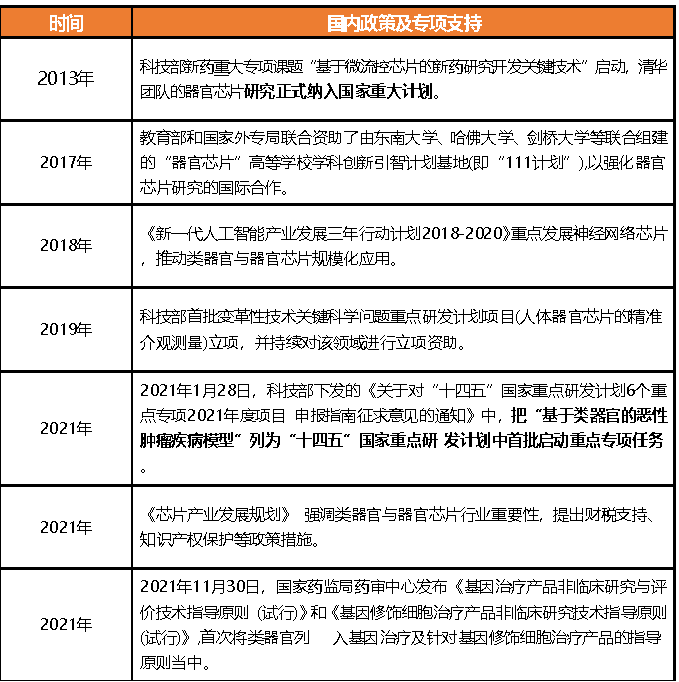 近几年,我国对类器官与器官芯片行业颁布了多项鼓励支持政策。2013年,器官芯片相关的科研就已经纳入科技部新药重大专项课题计划,2019年国家教育部和国家外专局就联合资助了由东南大学、哈佛大学、剑桥大学等联合组建的“器官芯片”高等学校学科创新引智计划基地(即“111计划”)以强化器官芯片研究的国际合作。CDE在2021年末颁布的《基因修饰细胞治疗产品非临床研究技术指导原则(试行)》中指出:针对基因修饰细胞治疗产品“当缺少相关动物模型时,可采用基于细胞和组织的模型(如二维或三维组织模型、类器官和微流体模型等)为有效性和安全性的评估提供有用的补充信息。如果没有合适的动物模型满足试验需要,应当依据科学原理开发相应的动物模型或使用更完善的体外试验系统、替代性模型(例如类器官)开展试验。”