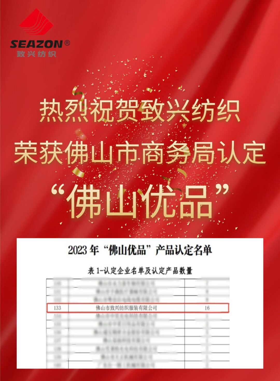 近日,佛山市商务局发布2023年“佛山优品”产品认定名单,共有270家企业、1175项产品通过本次认定。其中,佛山市致兴纺织服装有限公司共计16项产品获认定为“佛山优品”,凭借产品质量和市场口碑,成功入选该名单,是对企业产品品质和品牌综合实力强大的有力证明。