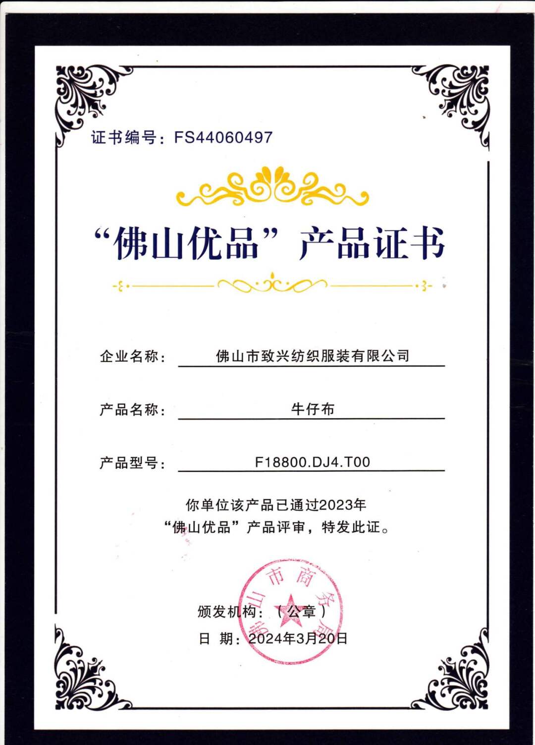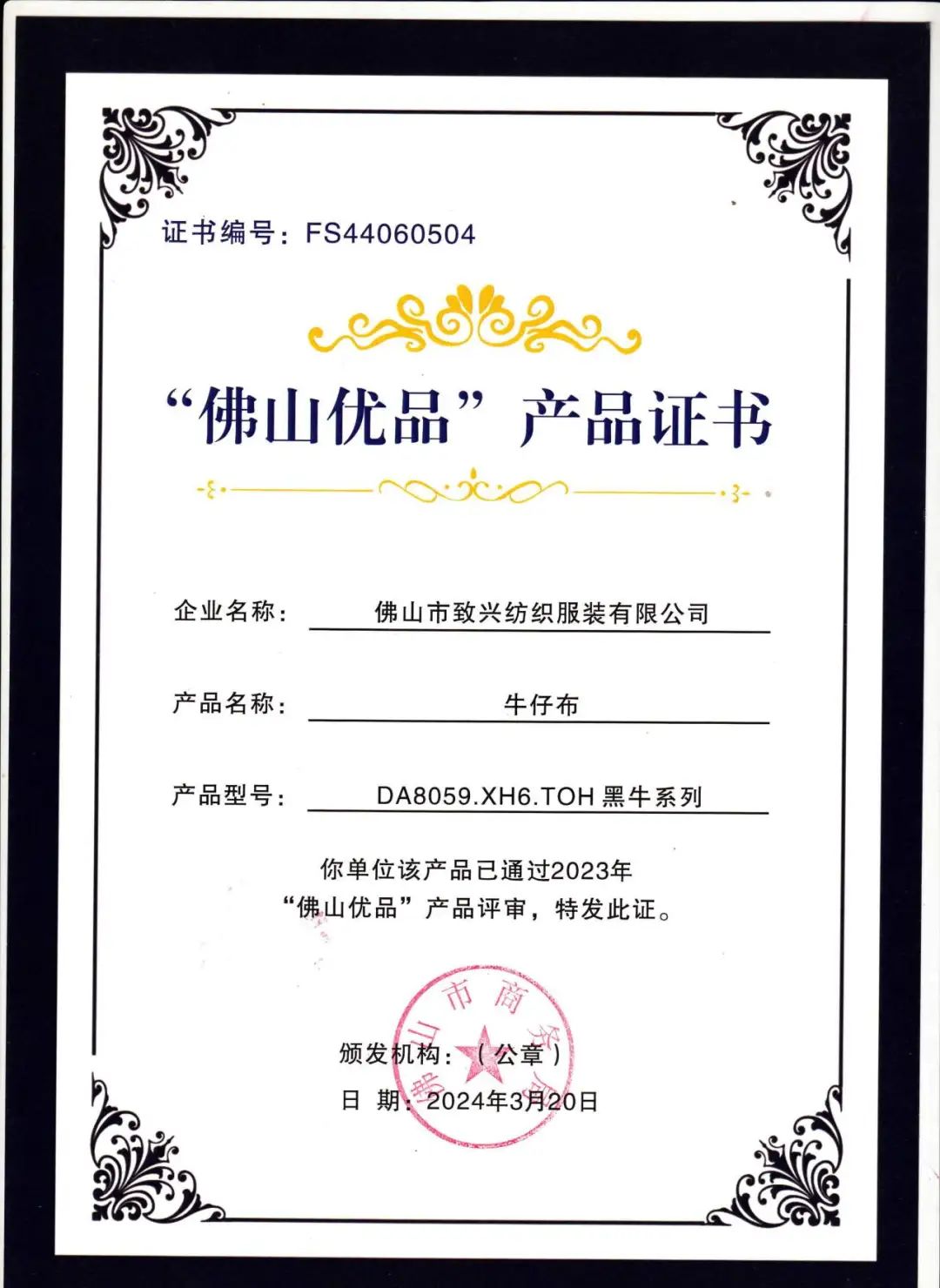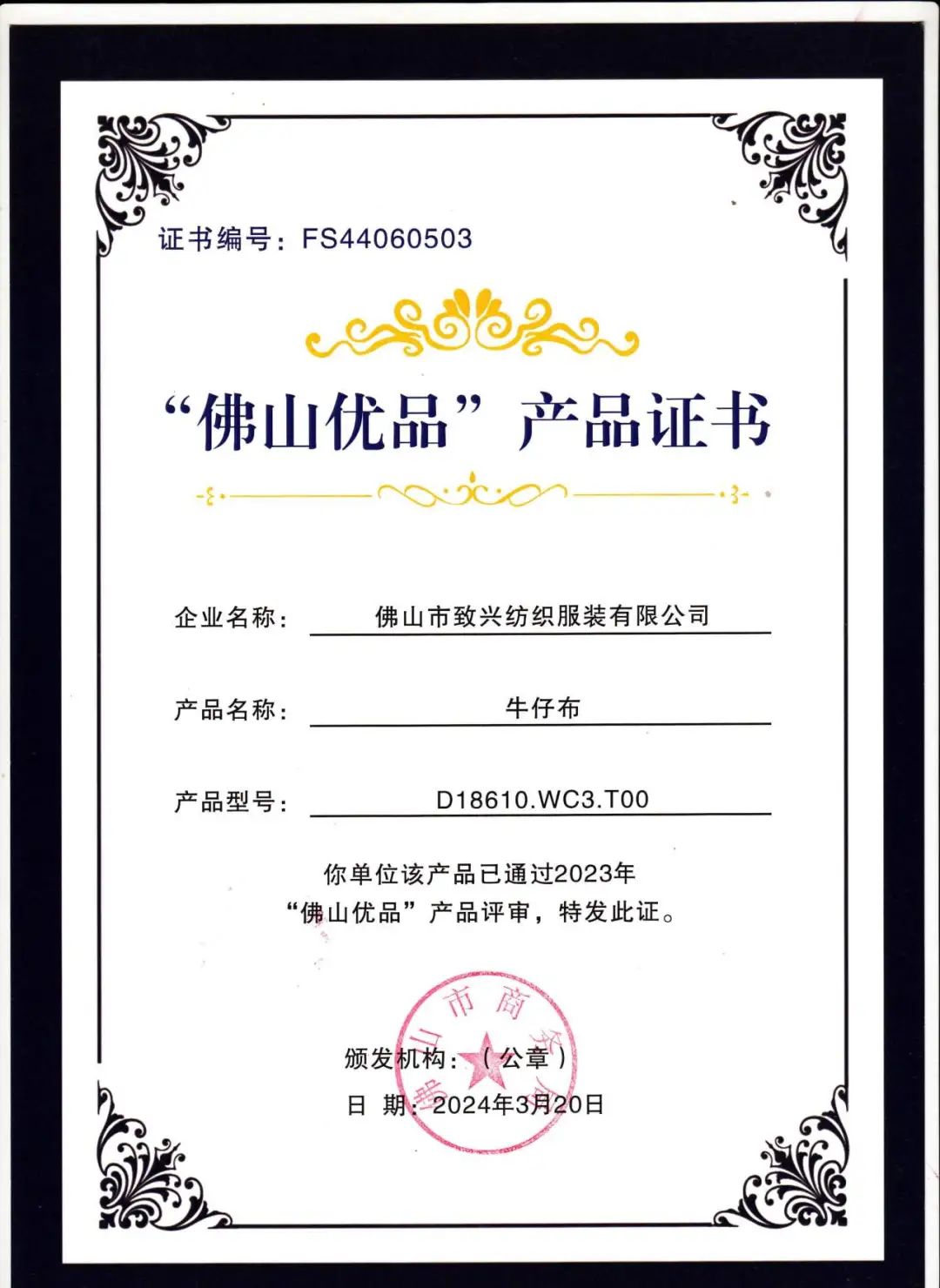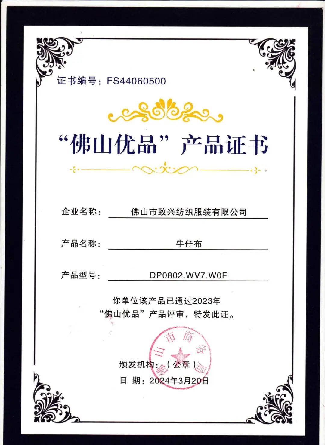 “佛山优品”产品证书的颁发不仅是对我们产品品质的肯定,更是对我们品牌价值的认可。这一认证背后,是我们致兴纺织不懈的努力和对品质执着追求的结晶。而这一荣誉,也将成为我们持续赢得客户信赖的重要保障。