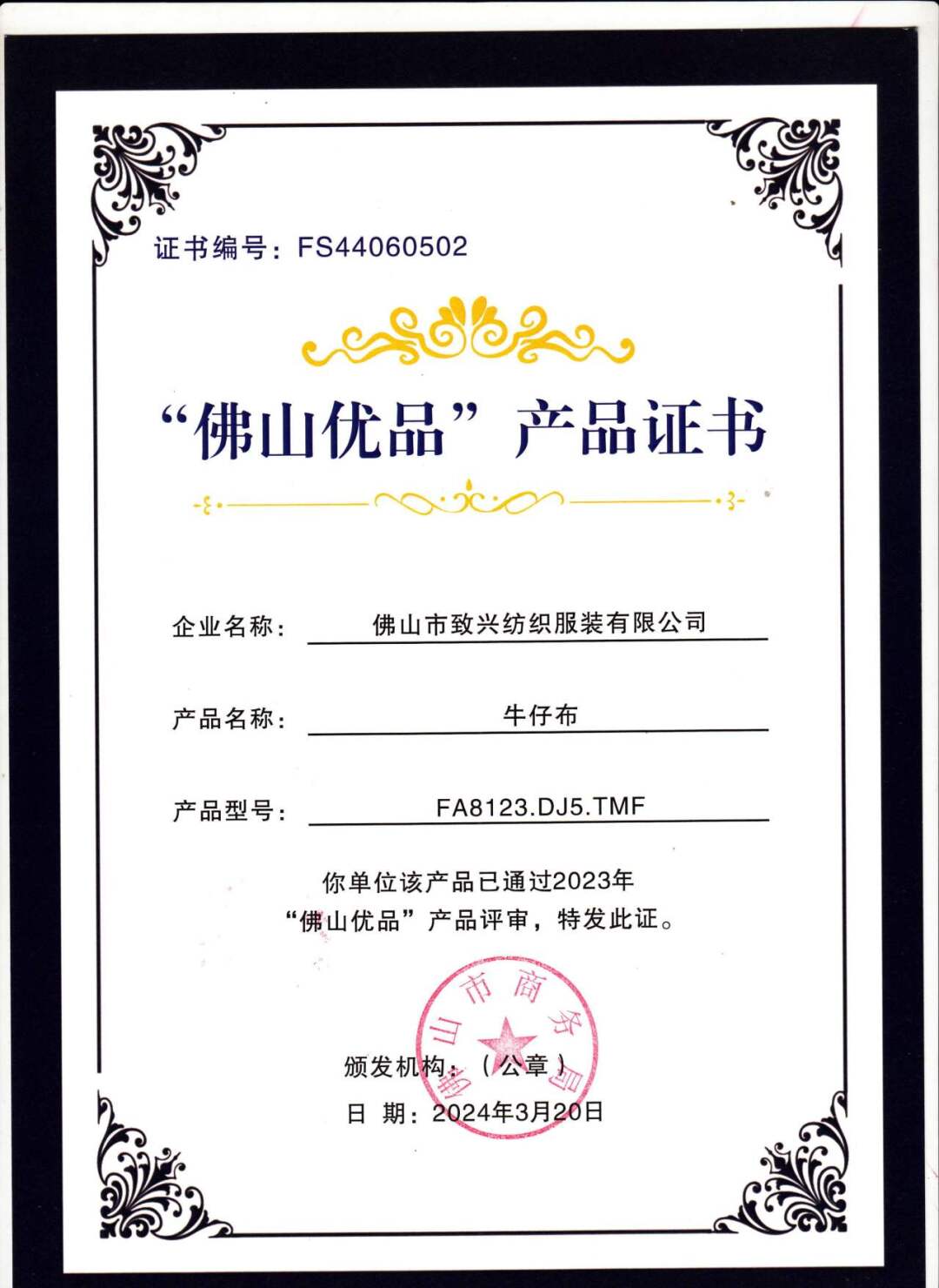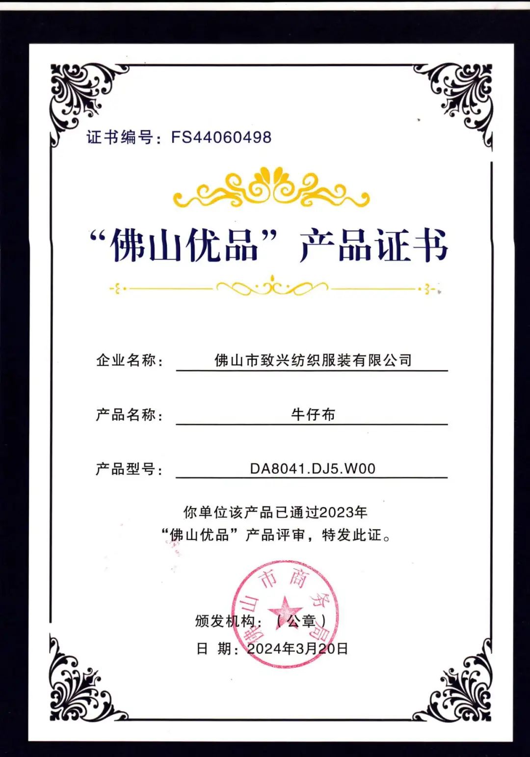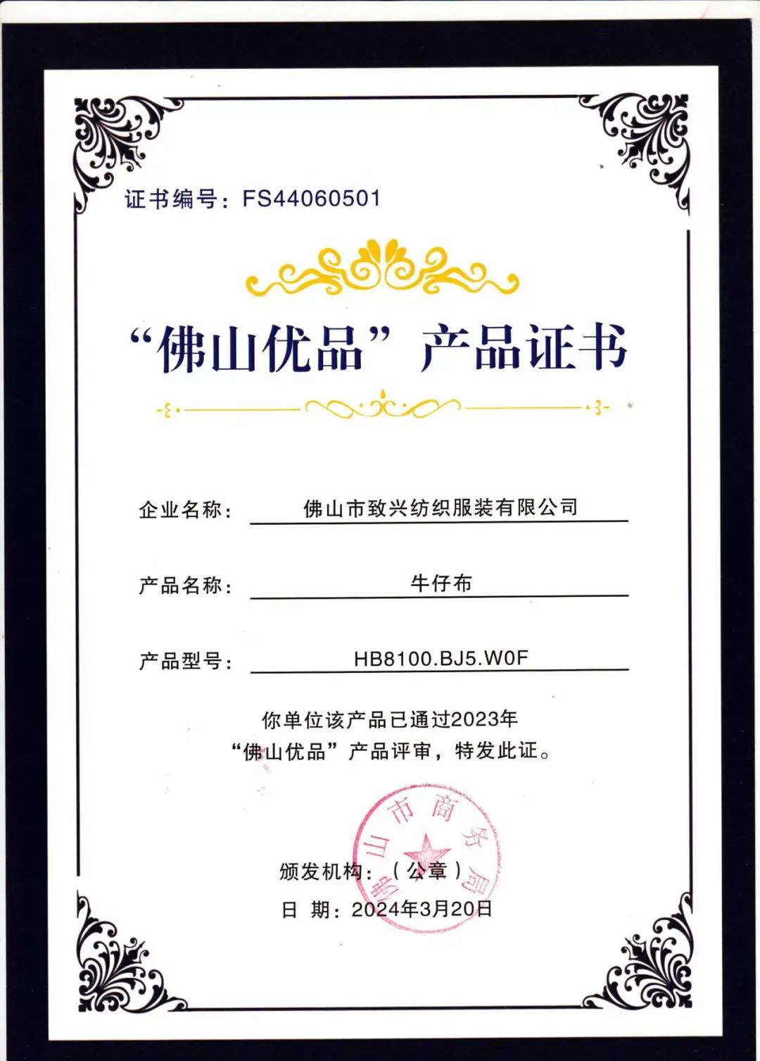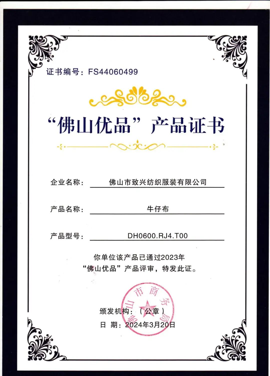 “佛山优品”产品证书的颁发不仅是对我们产品品质的肯定,更是对我们品牌价值的认可。这一认证背后,是我们致兴纺织不懈的努力和对品质执着追求的结晶。而这一荣誉,也将成为我们持续赢得客户信赖的重要保障。