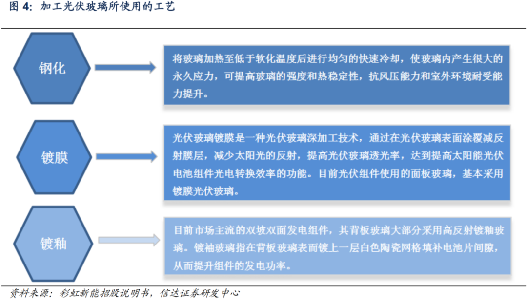 在制备光伏玻璃过程中为达到高强度、高透光和高耐候性的特点,需采用钢化、镀膜和镀釉等工艺。相较于普通玻璃,光伏玻璃的含铁量更低、承受温度更高、透光性、抗冲击性与耐腐蚀性更强。