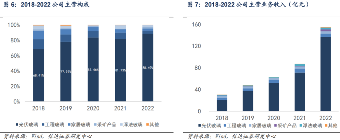 公司近年来光伏玻璃业务占比持续提升,为公司主要收入来源。2018 年到 2022 年,光伏玻璃业务占比从 68.41%提升至 88.49%,光伏玻璃业务营收从 2018 年 20.96 亿元增长至 136.82 亿元,CAGR 达到 46%。