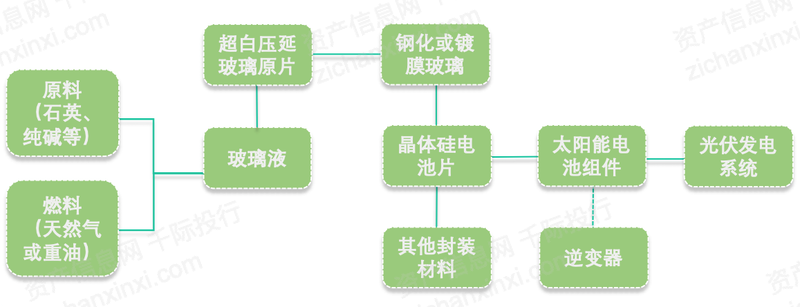光伏玻璃产业链上游主要包括石英砂、纯碱等原料和天然气等燃料,中游包括光伏组件各部分的制造环节,下游为封装后的光伏组件。太阳能光伏组件和逆变器应用于终端光伏发电系统。