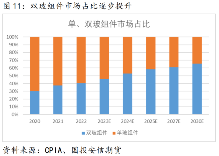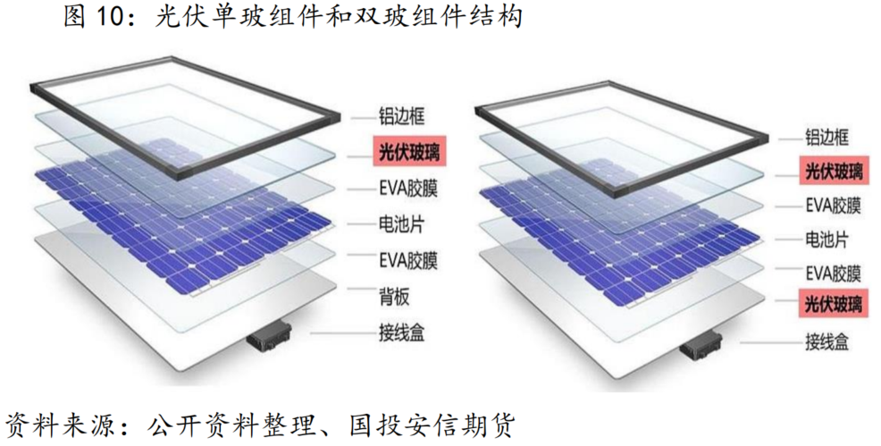 制作工艺的成熟和相关成本的下降带动双玻组件成本快速下降,目前单玻和双玻组件的成本相差不大。因此双玻组件中占比逐步提升,对光伏玻璃的需求量也随之增加。