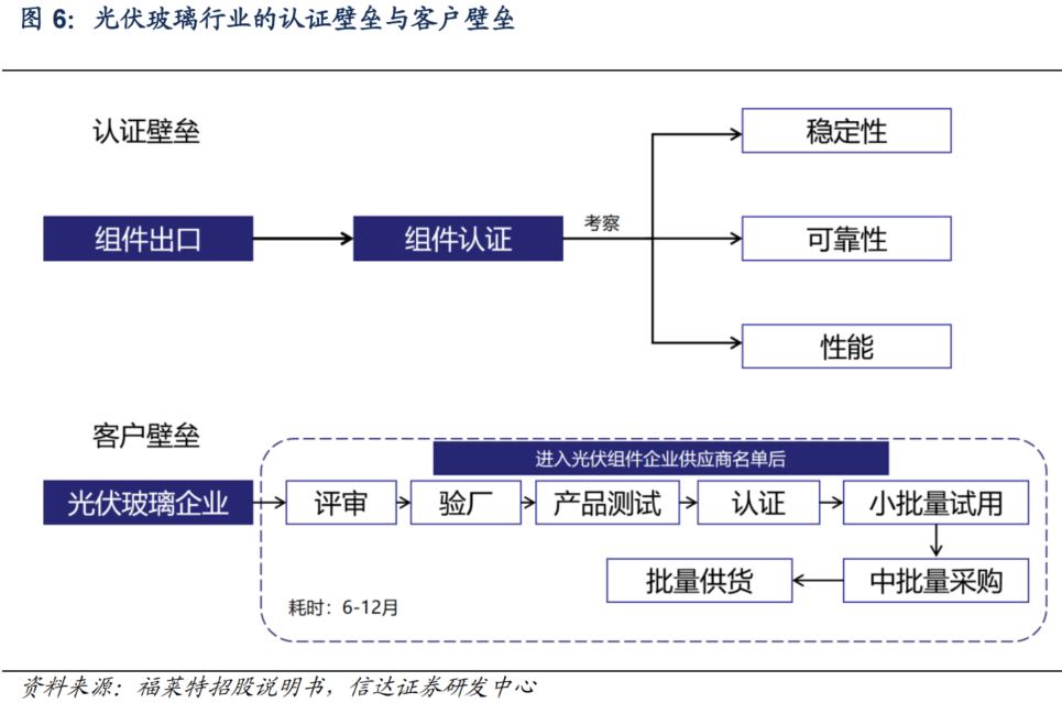 光伏玻璃行业客户壁垒较高。进入光伏组件企业供应商名录须面临供应商评审、验厂、产品测试、认证、小批量试用、中批量采购直至批量供货等众多环节,耗时一般达半年到一年。