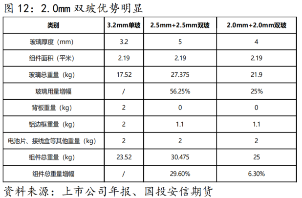 在使用双玻组件的过程中,重量问题是需要解决的一个难题,一般单玻组件用 3.2mm 光伏玻璃作面板,双玻可采用两块 2.5mm 或 2.0mm 厚度的光伏玻璃作为面板和背板。