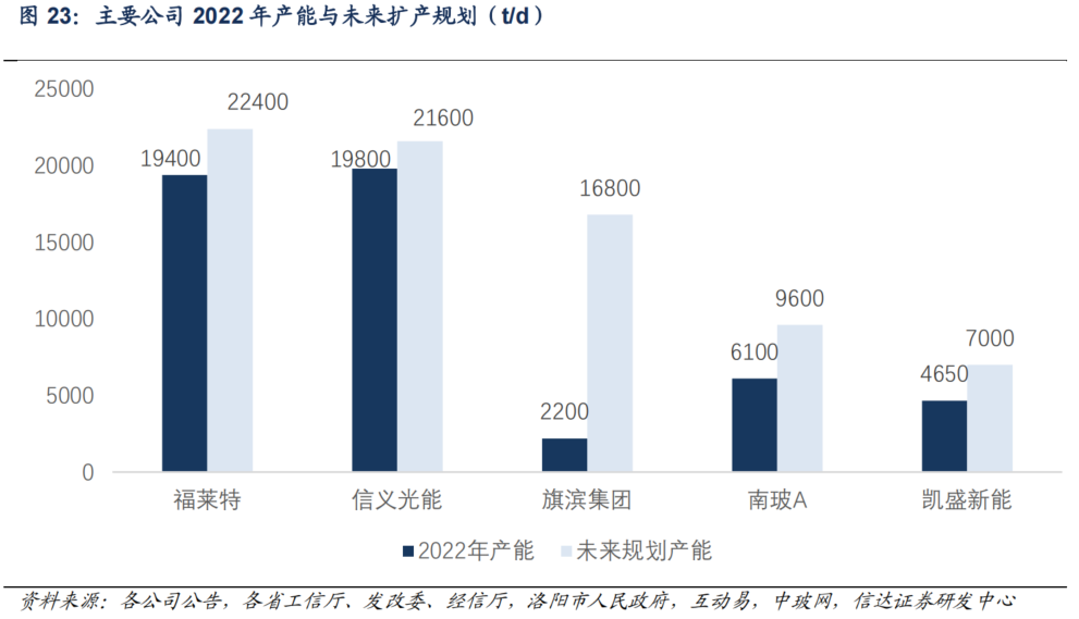与二三线企业相比,双寡头福莱特与信义光能产能扩张确定性更强,扩产规模更大,有望在竞争中占据更高的市场份额。截至 2023 年 5 月初,两家龙头公司的行业出货占比已经达到 60%,相比 2022 年底已经有所提 升,预计未来双龙头的市场份额有望进一步提升。