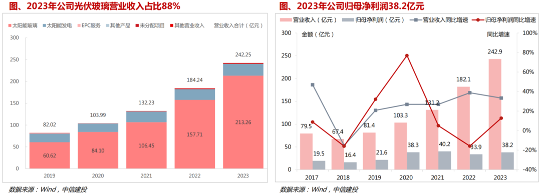 2023年公司光伏玻璃出货量约为11.5亿平(研究员测算),市占率约为28%,行业第一;2023H2公司光伏玻璃毛利率26.4%,行业领先,主要系公司天然气成本优势显著。