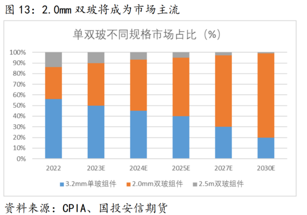 随着组件轻量化、双玻组件以及新技术的不断发展,未来 2.0mm 双玻组件份额将逐步提升,2.5mm 双玻组件和 3.2mm 单玻组件市场份额逐步衰退,2.0 双玻组件将成为市场主流。
