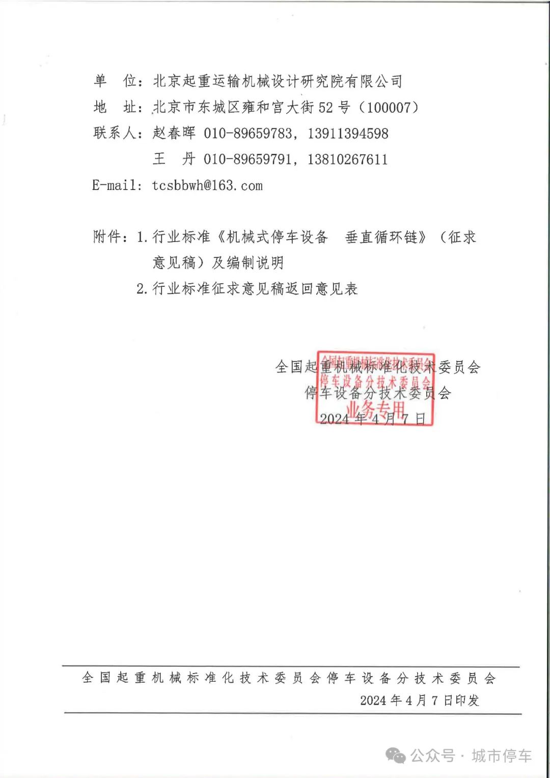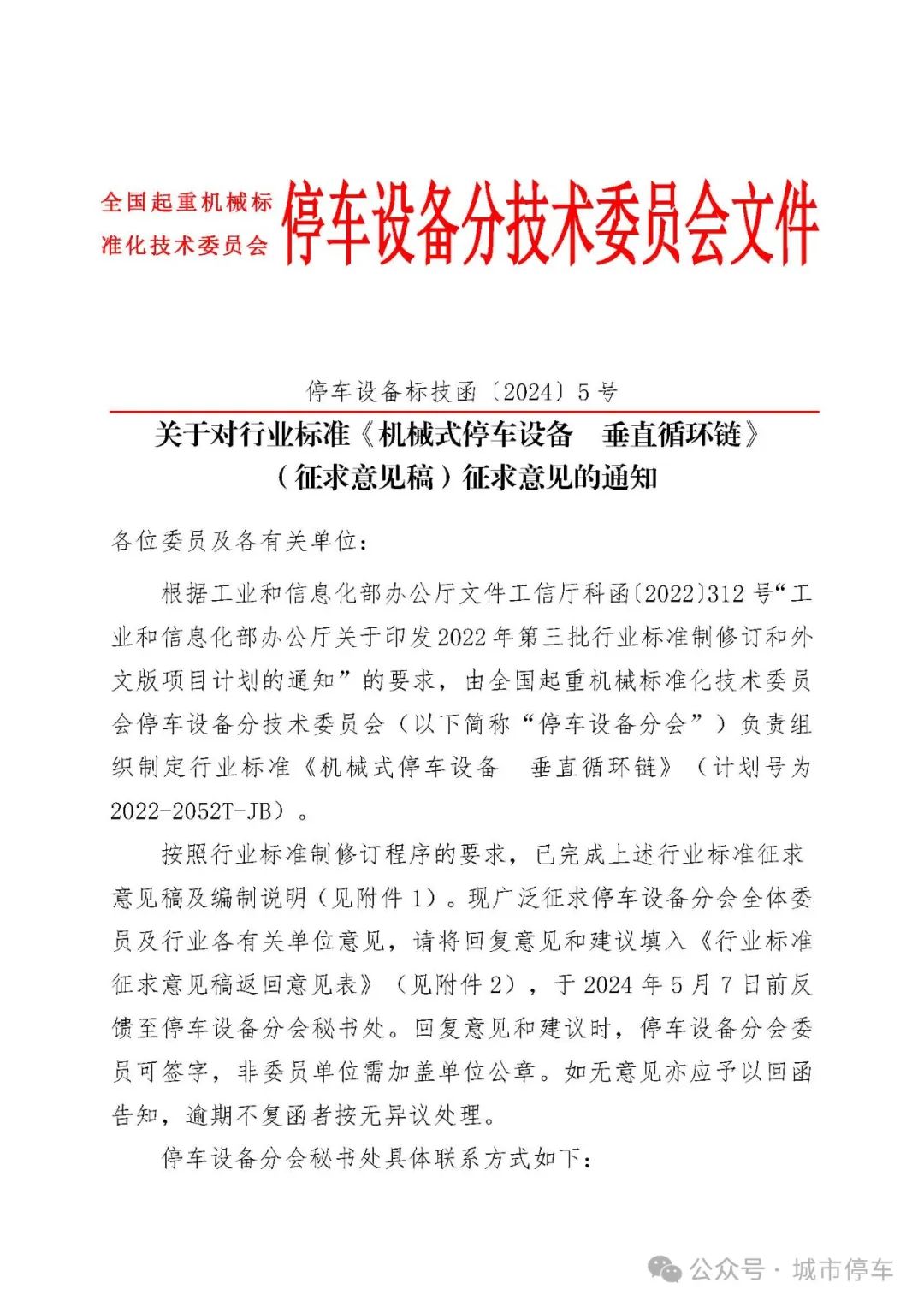 4月7日,行业标准《机械式停车设备 垂直循环链》(征求意见稿)广泛征求意见。意见反馈时间为2024年5月7日前。