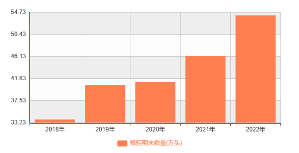 随着驼奶产业的爆发式增长,中国的骆驼存量不断递增式突破新高。至2022年底,已经打破50万头存量大关。新疆、内蒙等传统骆驼养殖地得到了众多驼乳企业的青睐,从牧场养殖到驼奶加工,再到配送营销,驼奶产业链已经趋近完善。与此同时,中国对中亚进口规模不断扩大,以利用中亚五国的优质畜牧业资源刺激国内市场增长。