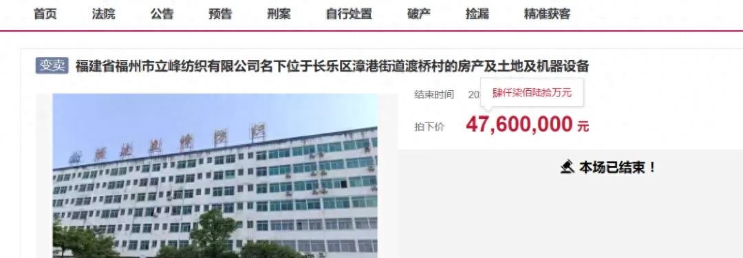 4月3日,在清明节前,在福州市网上司法拍卖市场上,迎来了一宗重量级的房产拍卖,一家纺织厂被打包拍卖了。此次拍卖的是福州市立峰纺织有限公司名下位于长乐区漳港街道渡桥村的房产及土地及机器设备,爱企查显示,福州市立峰纺织有限公司成立于1994年11月04日,也是一家老牌纺织厂,注册资本1个亿,可惜现在已经被列为失信人了,纺织厂也空置不生产了。此次拍卖的纺织厂,起拍价为4760万元,最终,拍卖结束的时候,只有一个人报名竞拍,以起拍价就拿下了该纺织厂。