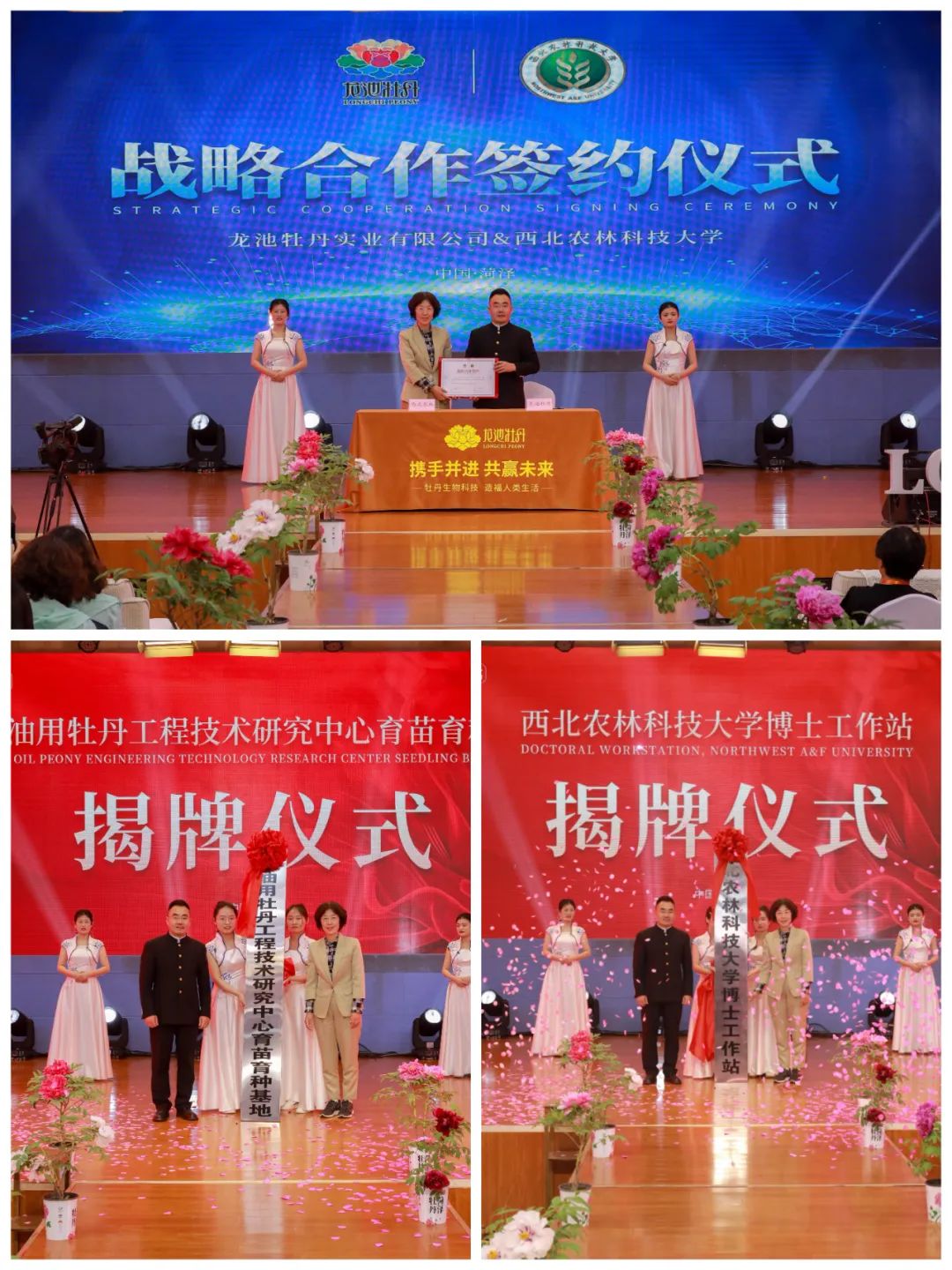 值得一提的是,在本次论坛上,龙池牡丹与西北农林科技大学达成了战略合作。双方将共同推进牡丹产业的科研创新和技术转化,为牡丹产业的高质量发展注入新的动力。同时,龙池牡丹实业有限公司与西北农林科技大学还联合成立了“国家油用牡丹工程技术研究中心育苗育种基地”和“西北农林科技大学博士工作站”,并举行了隆重的揭牌仪式。这一举措标志着龙池牡丹在牡丹研发领域和科技创新领域取得了新的突破。