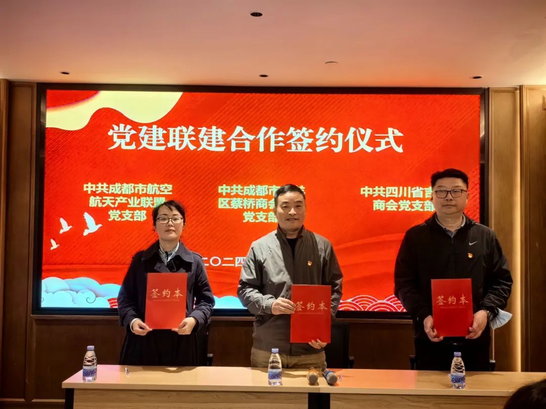 在讲座正式开始前,为了加强商协会党支部之间的联系与深化党建共建合作,在三方商会会员单位部分代表的见证下,青羊区蔡桥商会联合党支部、成都市航天航空产业联盟党支部与四川省吉林商会党支部三位书记与代表共同签署了党建联建合作协议。