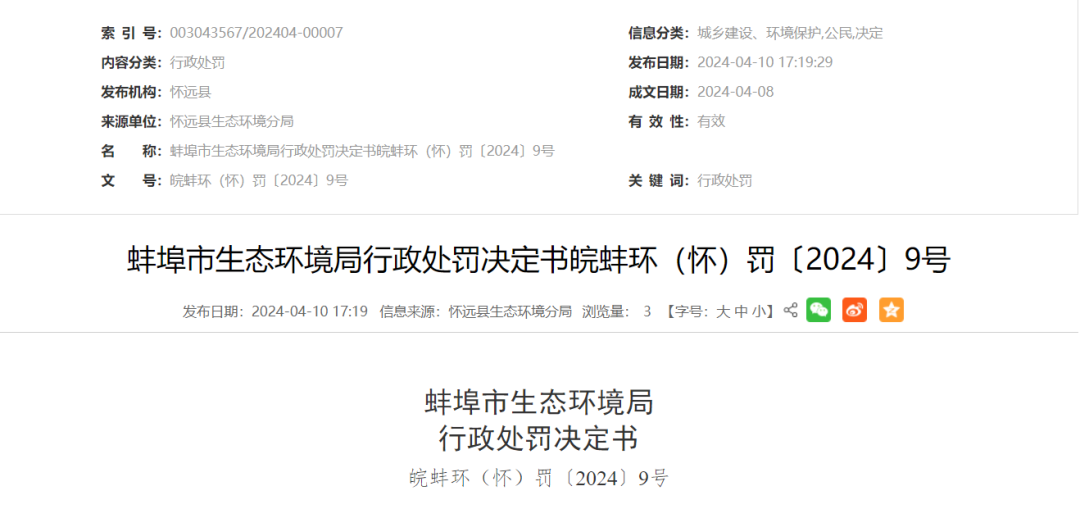 4月8日,安徽省蚌埠市生态环境局,发布一份行政处罚决定书。
