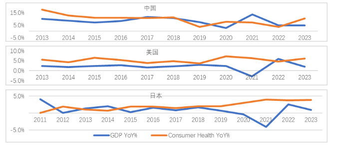 (快消品讯)日前,欧睿国际发布了《营养健康食品行业发展报告》。从GDP增速与营养健康食品行业增速的对比来看,中国、美国和日本这三个国家中,营养健康食品行业的增长表现均相当稳定,几乎未受到经济波动的显著影响。