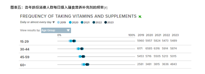 2023至2026年,中国老年人口年复合增长率达2.6%。随着其预防保健意识的提升,对营养健康食品的需求和消费习惯也在增强。欧睿调研显示,2019-2023年间,60岁以上老龄人口每日服用维生素及膳食补充剂的比例明显上升。