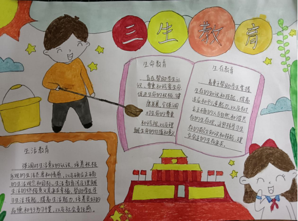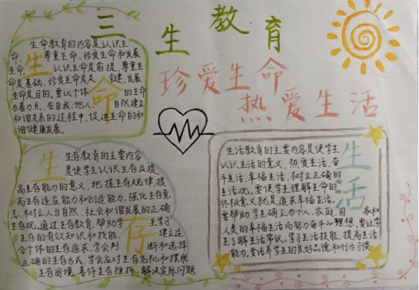 “三生教育”是全面推进素质教育的基本要求,本次活动中学生以“三生教育”为核心,通过自行查阅资料并绘制手抄报,着眼于促进学生的成长、成人、成才,着力于开启学生心智,培养学生的责任感、创新精神和实践能力,促进学生全面发展。学生都认真对待,创作的作品主题明确醒目,字体端正清晰,内容切合主题,使“三生教育”更加深入人心。