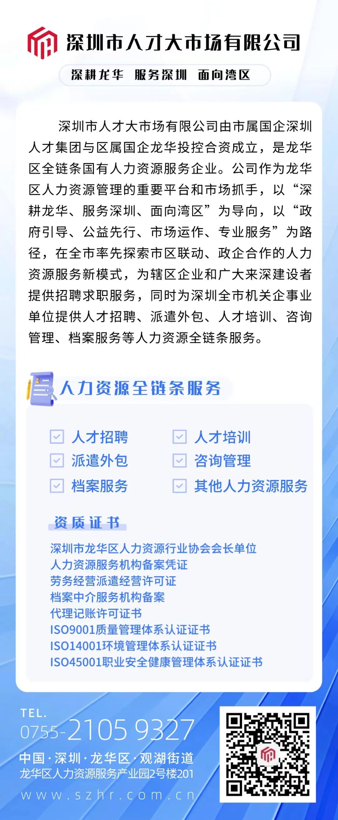 作为全市人力资源服务行业的“国企老字号”和“金字招牌”,深圳人才大市场自首批进驻龙华人才园以来,持续发挥国企引领和示范作用。三年多来,在公益人力资源市场建设运营、各类各层次人才引进、党建引领助推行业高质量发展、履行国企社会责任、服务辖区就业大局等方面做出了显著的贡献,累计服务企业近千家次、服务求职者逾万人,为龙华人才园跨越式发展打造“国家级园区”提供了有效助力。依托深圳人才集团“掌才易”、“深i优才”云招聘等平台,公司共计开展线上线下招聘会百余次,为全市特别是龙华区机关企事业单位提供了专业的多类型人才服务。公司近期还成功举办了“名企有约”2024年首场招聘活动。