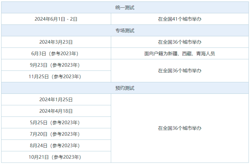 证券行业专业人员水平评价测试有统一测试、专场测试、预约测试三种不同形式的测试,统一测试拟举办1次,专场测试拟举办4次,预约测试拟举办6次。2024年证券行业专业人员水平评价测试时间如下: