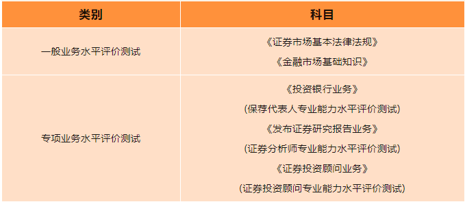 2024年证券从业水平评价测试考试科目分为“一般业务水平评价测试”和“专项业务水平评价测试”两个类别。五个科目。各位考生考过从业之后可以报考证券专项科目。具体情况如下表所示: