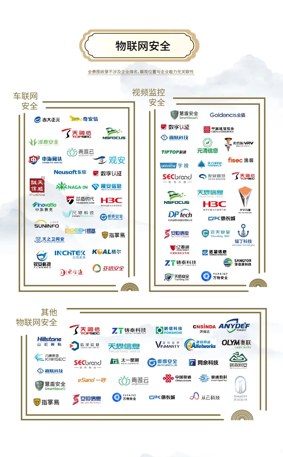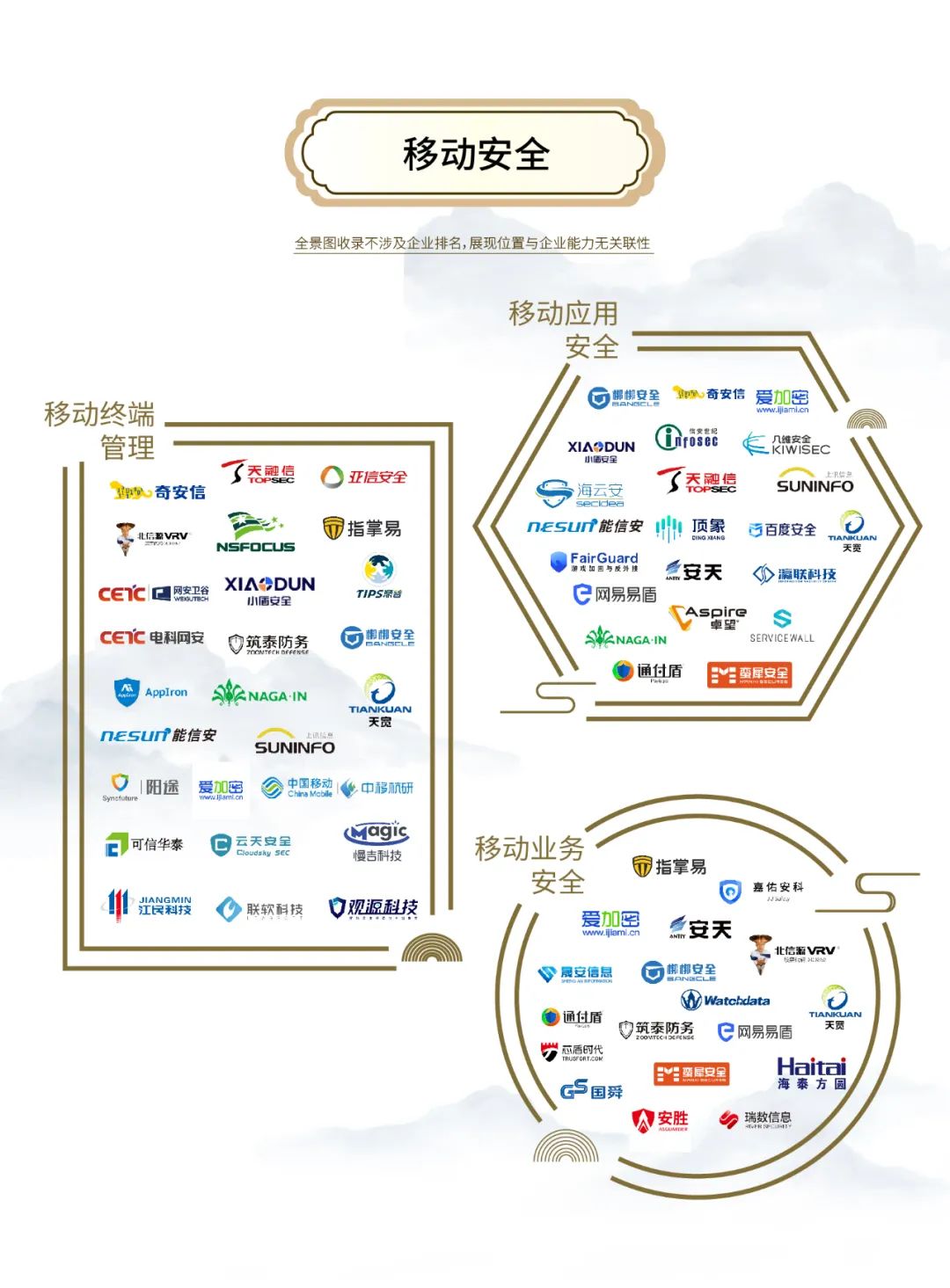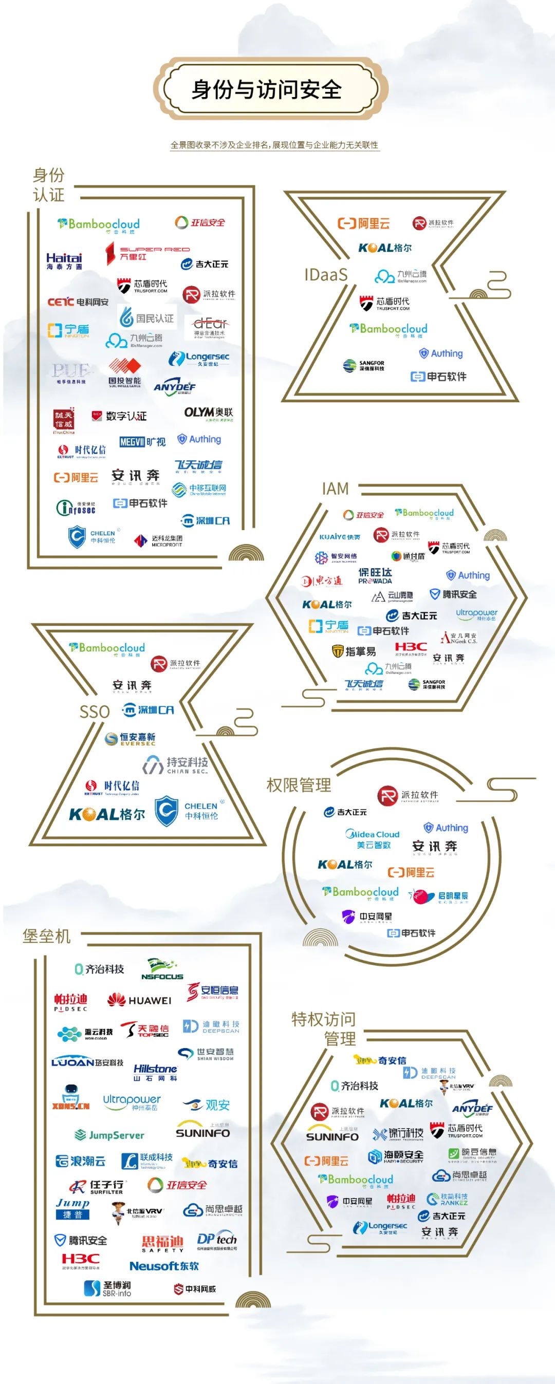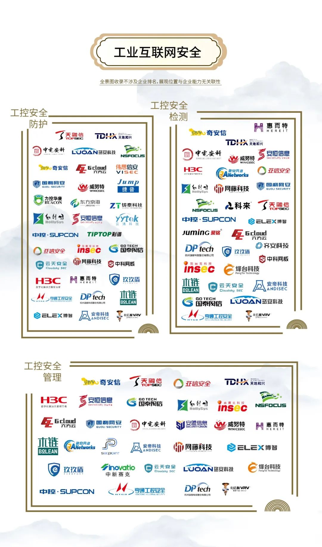 由于实际收录企业数量不足5家,本次全景图中的“拟态防御/动态防御”、“量子密码”、“IT风险管理与审计”、“安全测评与认证”4个二级细分领域在发布时不作展现,原因是对上述领域中相关方案产品的实际可用性需要进一步调研论证,会在下次全景图更新时重点关注。