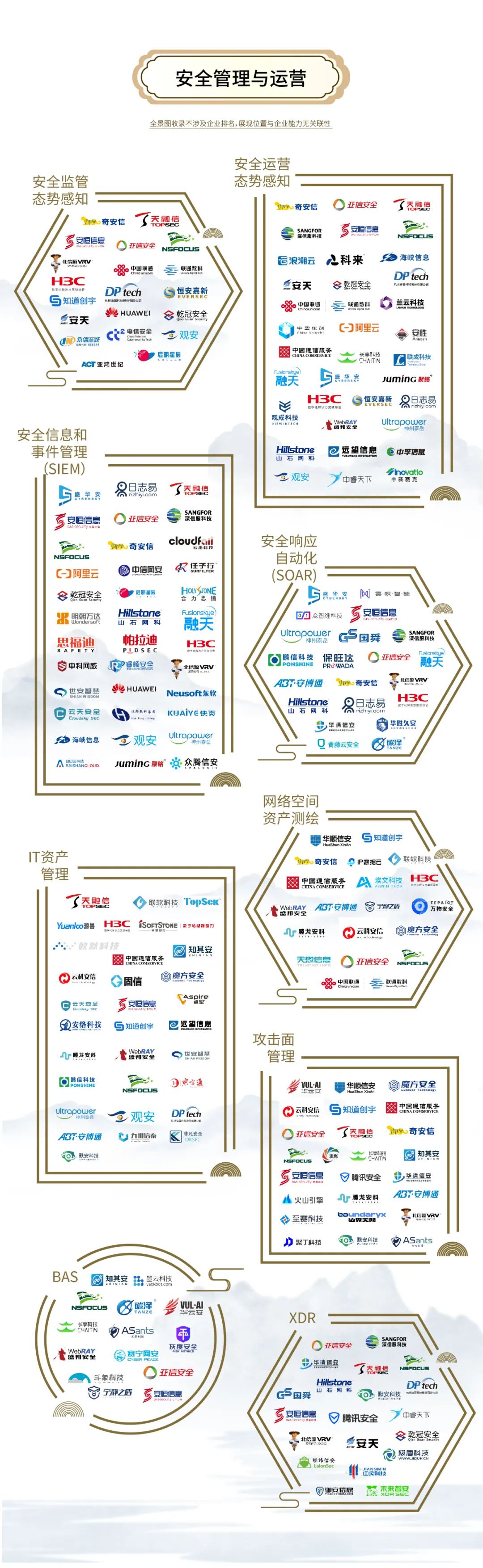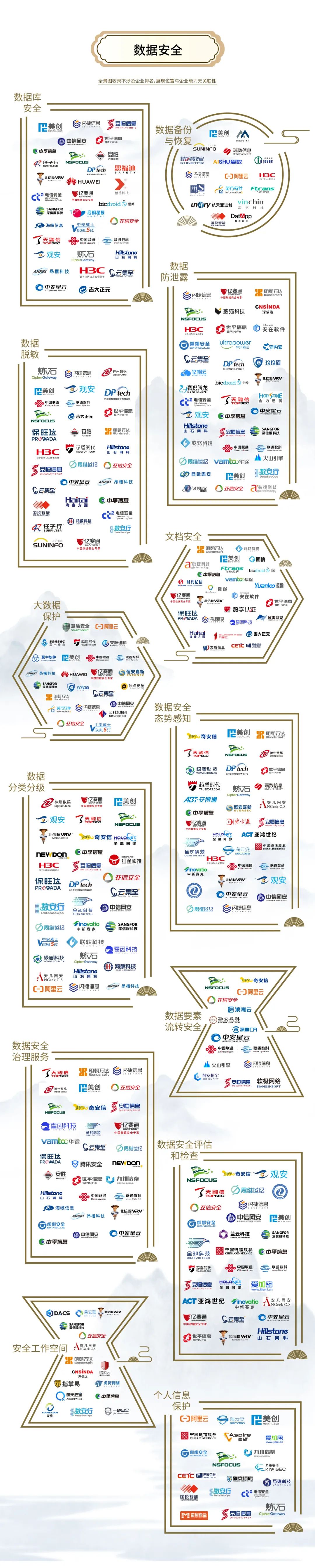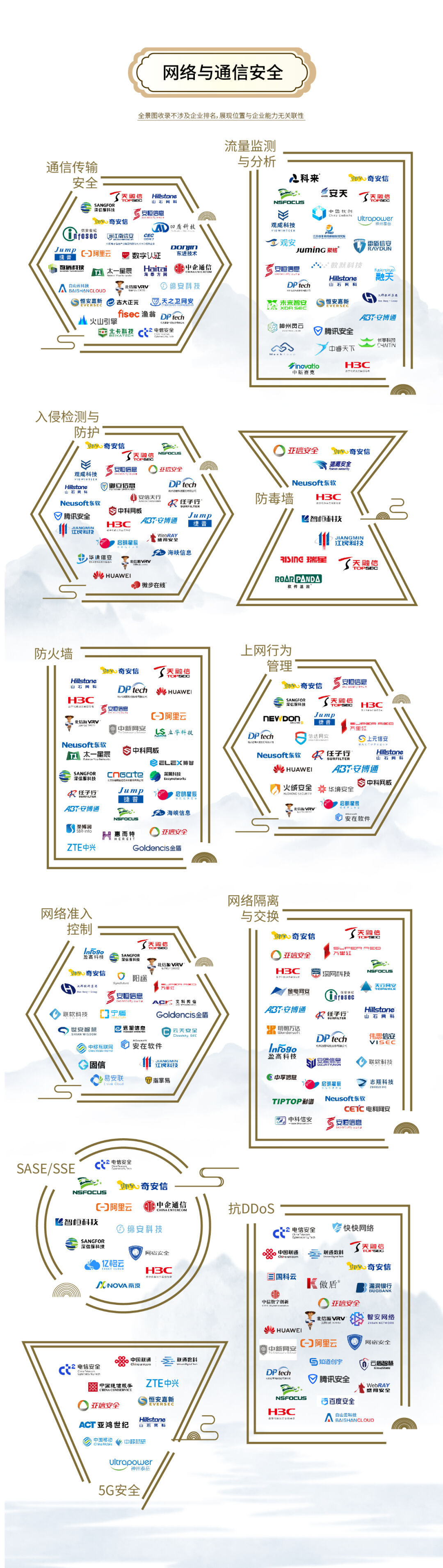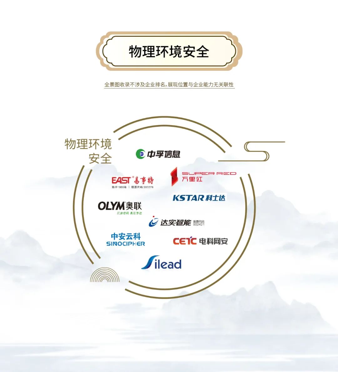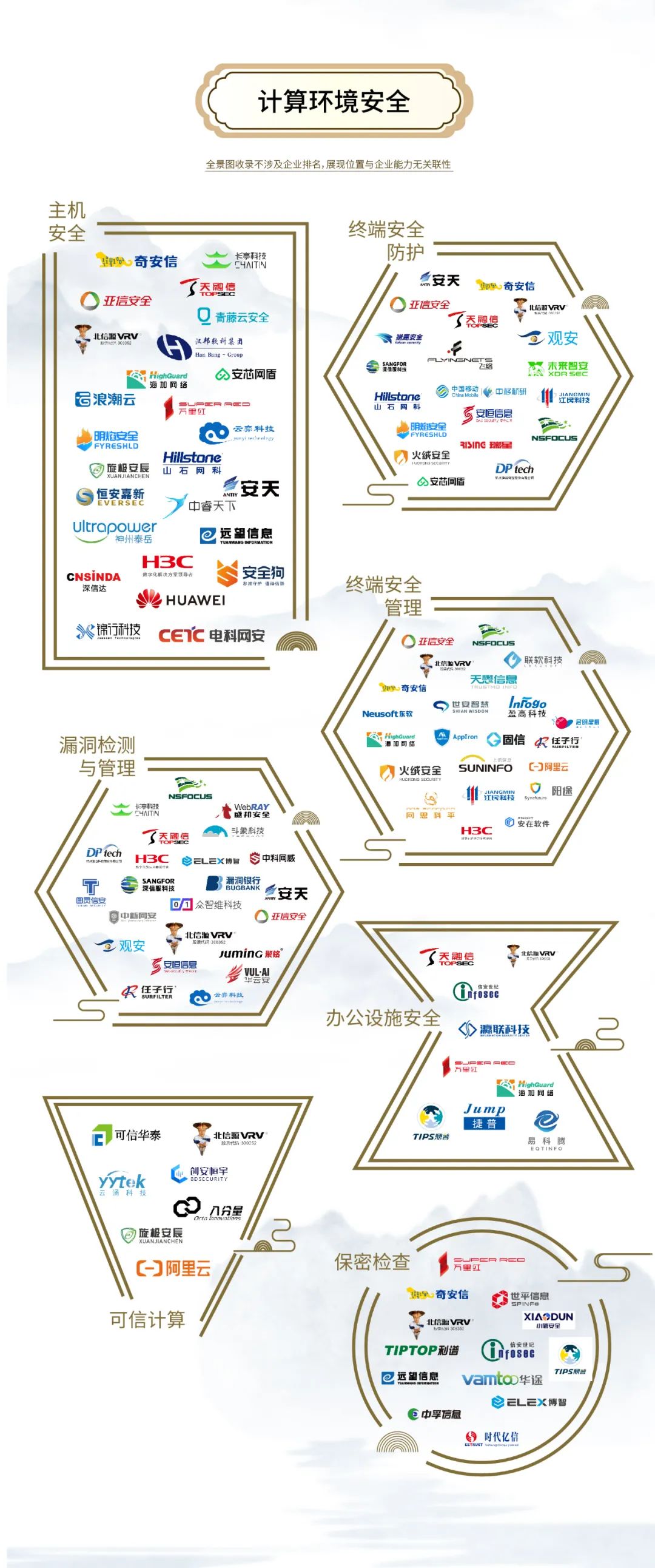 由于实际收录企业数量不足5家,本次全景图中的“拟态防御/动态防御”、“量子密码”、“IT风险管理与审计”、“安全测评与认证”4个二级细分领域在发布时不作展现,原因是对上述领域中相关方案产品的实际可用性需要进一步调研论证,会在下次全景图更新时重点关注。