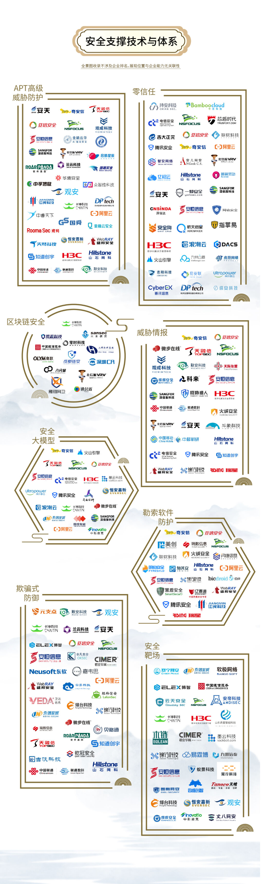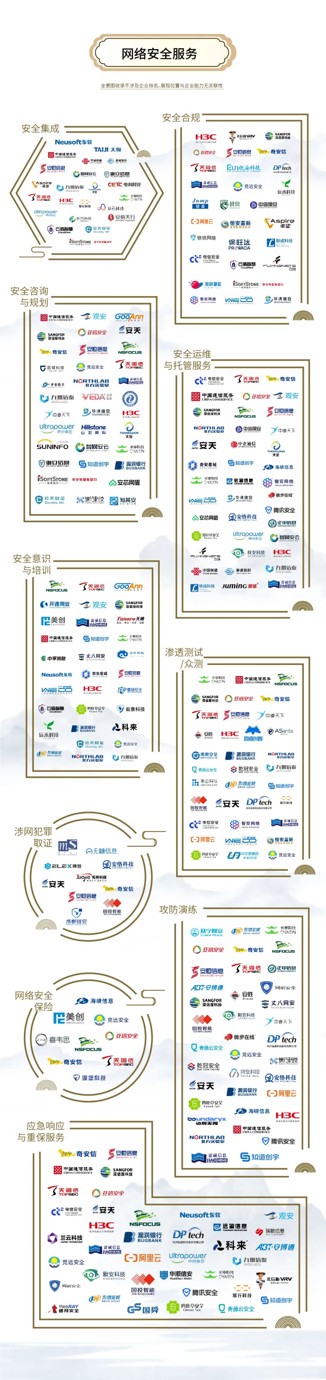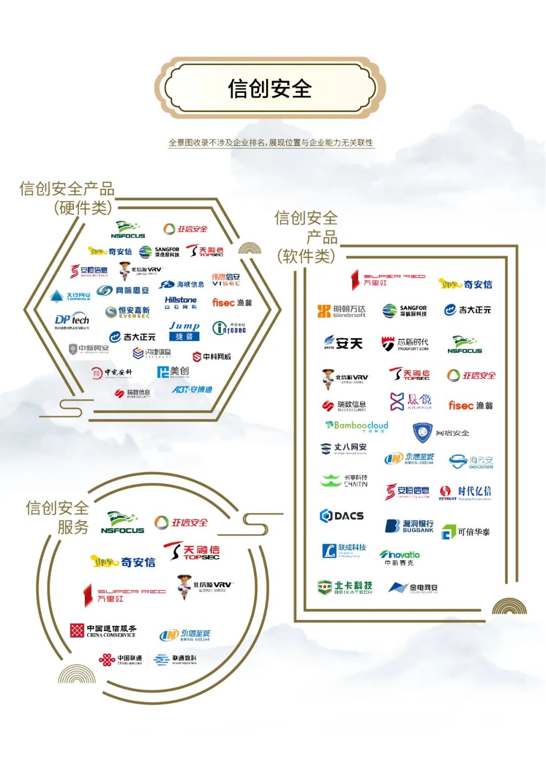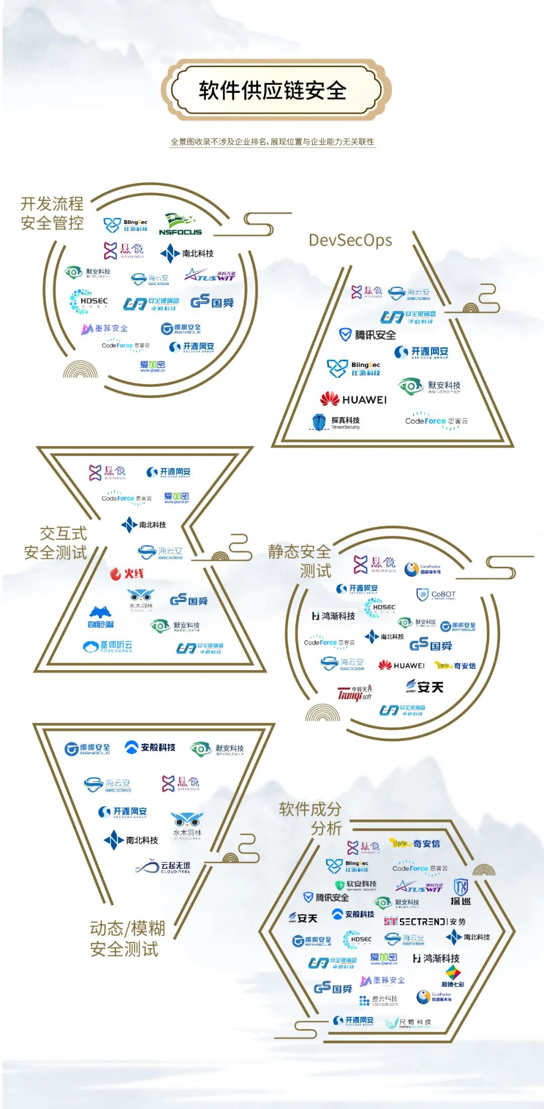 由于实际收录企业数量不足5家,本次全景图中的“拟态防御/动态防御”、“量子密码”、“IT风险管理与审计”、“安全测评与认证”4个二级细分领域在发布时不作展现,原因是对上述领域中相关方案产品的实际可用性需要进一步调研论证,会在下次全景图更新时重点关注。