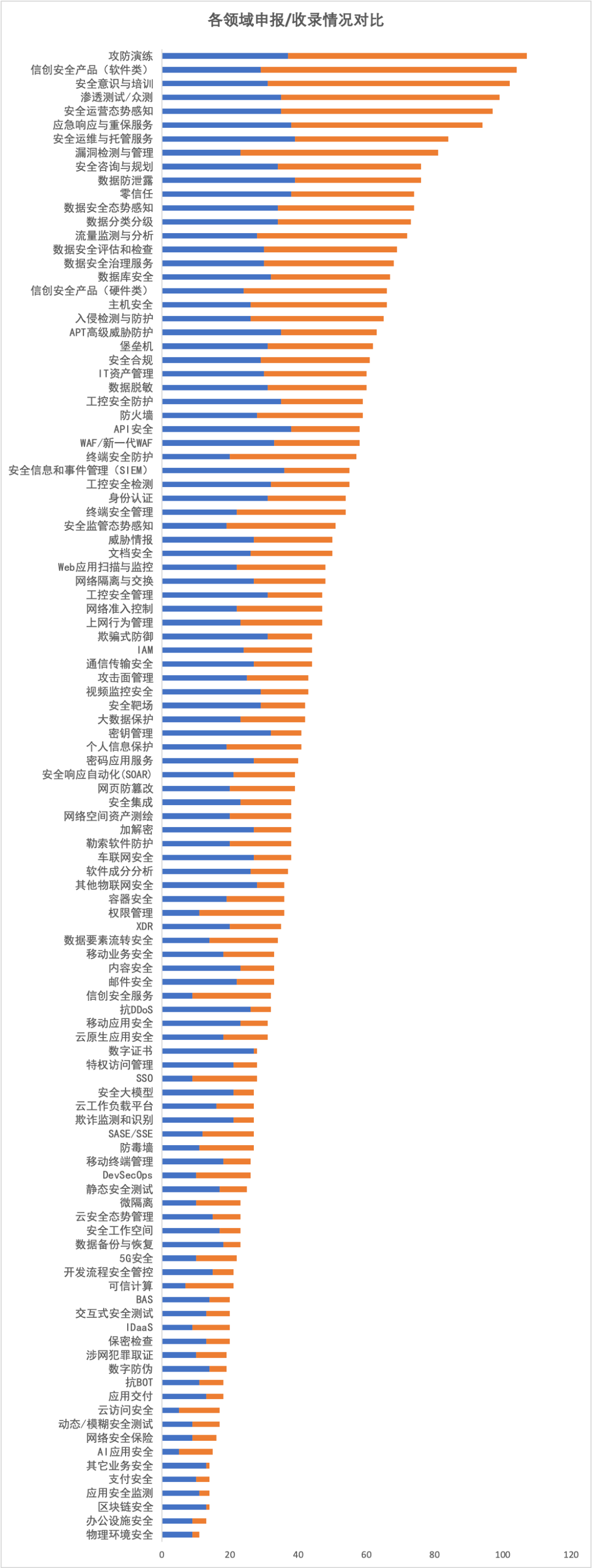 3、数据统计显示,第十一版全景图中厂商申报数量最多的二级安全领域是攻防演练(109家厂商申报,实际收录37家),其后分别是软件类信创安全产品(105家厂商申报,实际收录29家)、安全意识与培训(103家厂商申报,实际收录31家),完整细分领域申报/收录对比情况见下图。