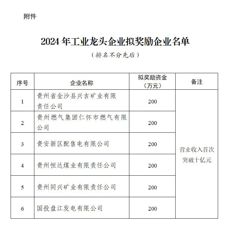 省能源局关于2024年工业龙头企业拟奖励企业名单的公示