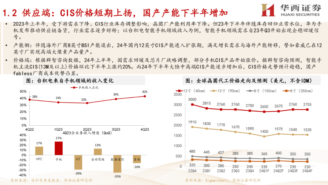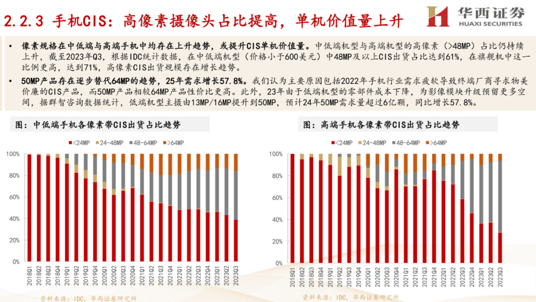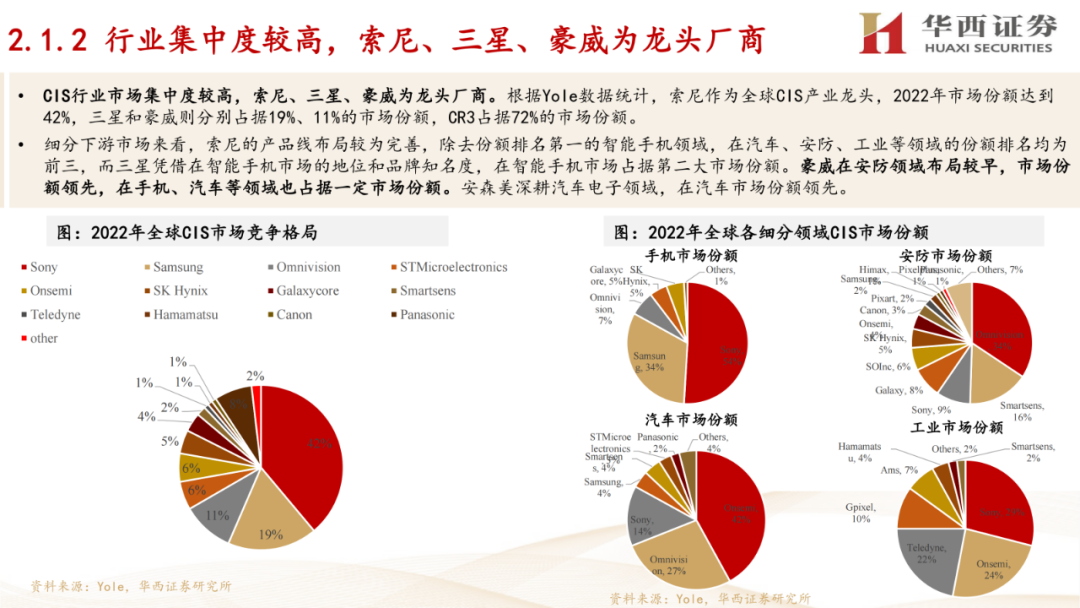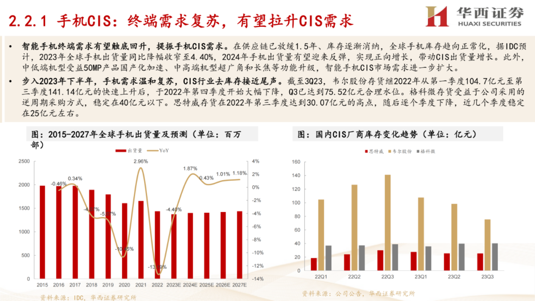2. 未来市场与格局:预测了2028年全球CIS市场规模将达到287.58亿美元,细分市场增速较快。同时,报告指出CIS行业市场集中度较高,索尼、三星、豪威为龙头厂商。手机市场方面,预测2024年全球手机出货量将迎来反弹,并推动CIS需求增长。汽车市场方面,预测2028年全球汽车CIS市场规模有望达到36亿美元。
