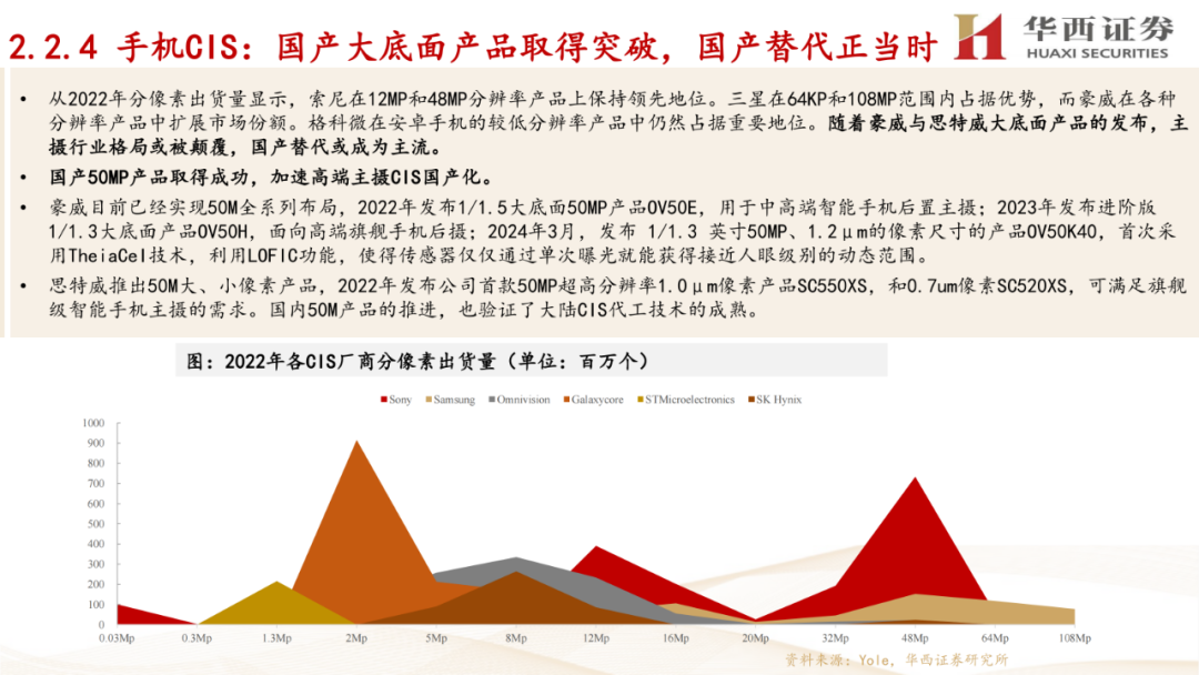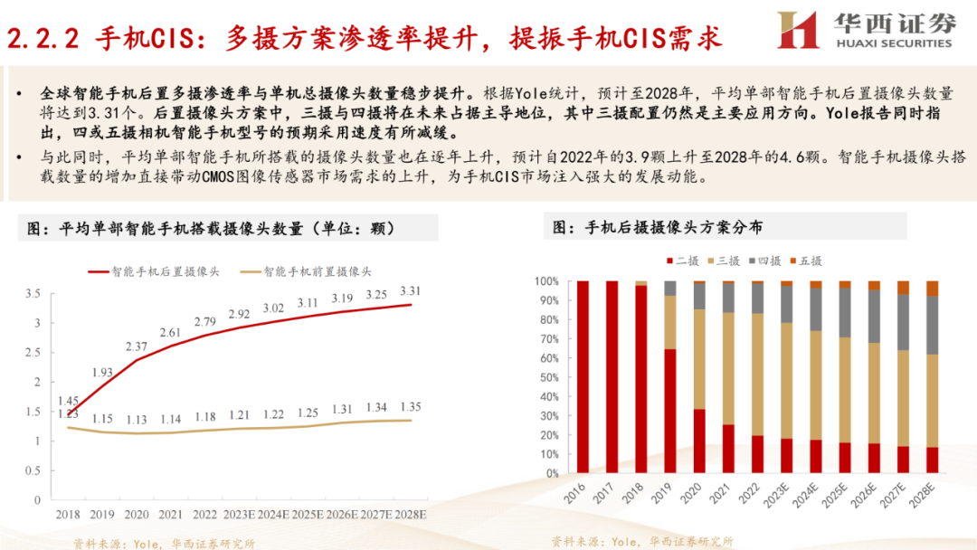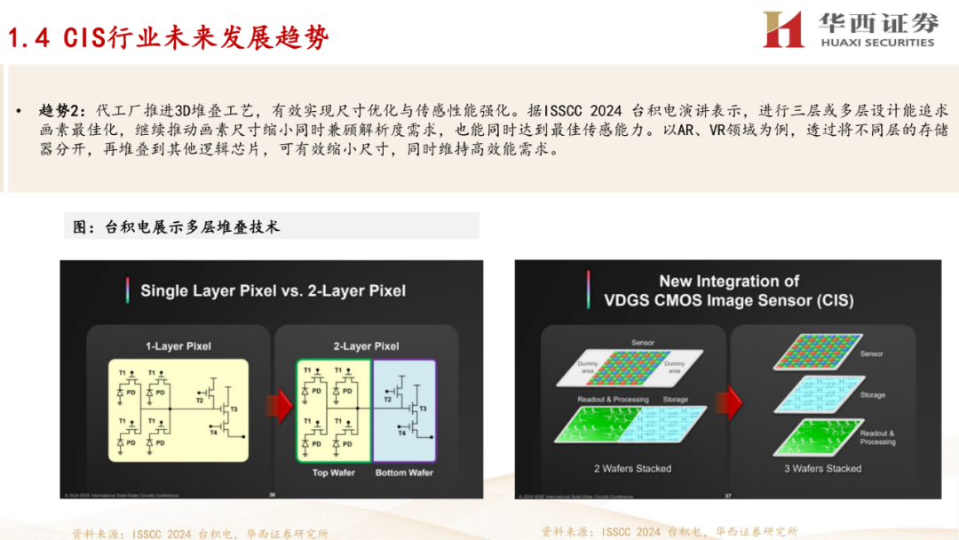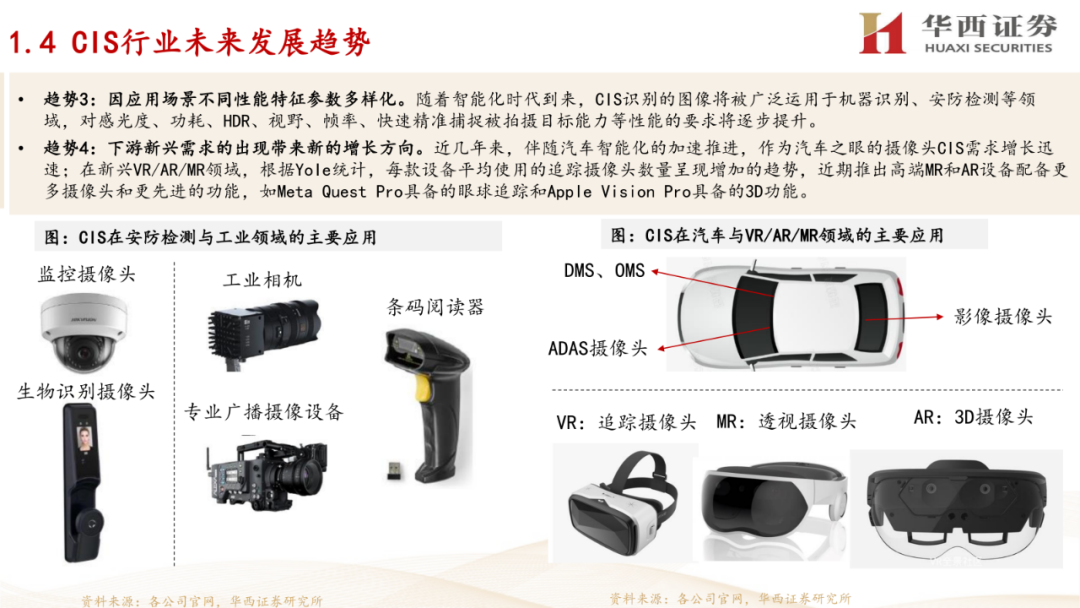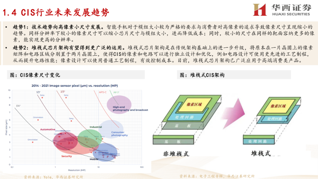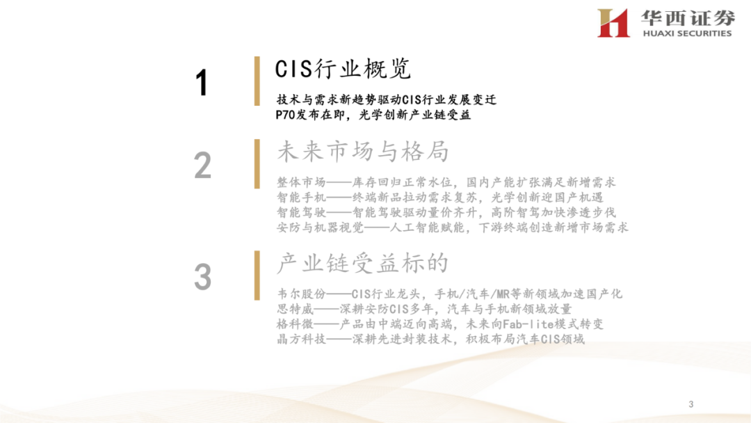 1. CIS行业概述:介绍了CIS(互补金属氧化物半导体图像传感器)的定义、工作原理,以及其在手机、汽车、安防监控等领域的应用情况。报告还分析了CIS行业的发展趋势,包括像素尺寸的减小、堆栈式芯片结构的应用、性能特征的多样化,以及下游新兴需求的出现。