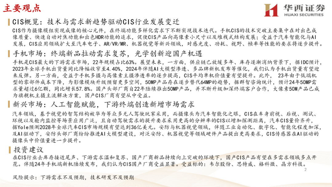 3. 产业链相关公司:对韦尔股份、思特威、格科微、晶方科技等产业链相关公司进行了对比,包括它们的CIS收入、毛利率、代表性产品、下游收入结构等。报告还分别分析了这些公司的竞争优势和业务布局。
