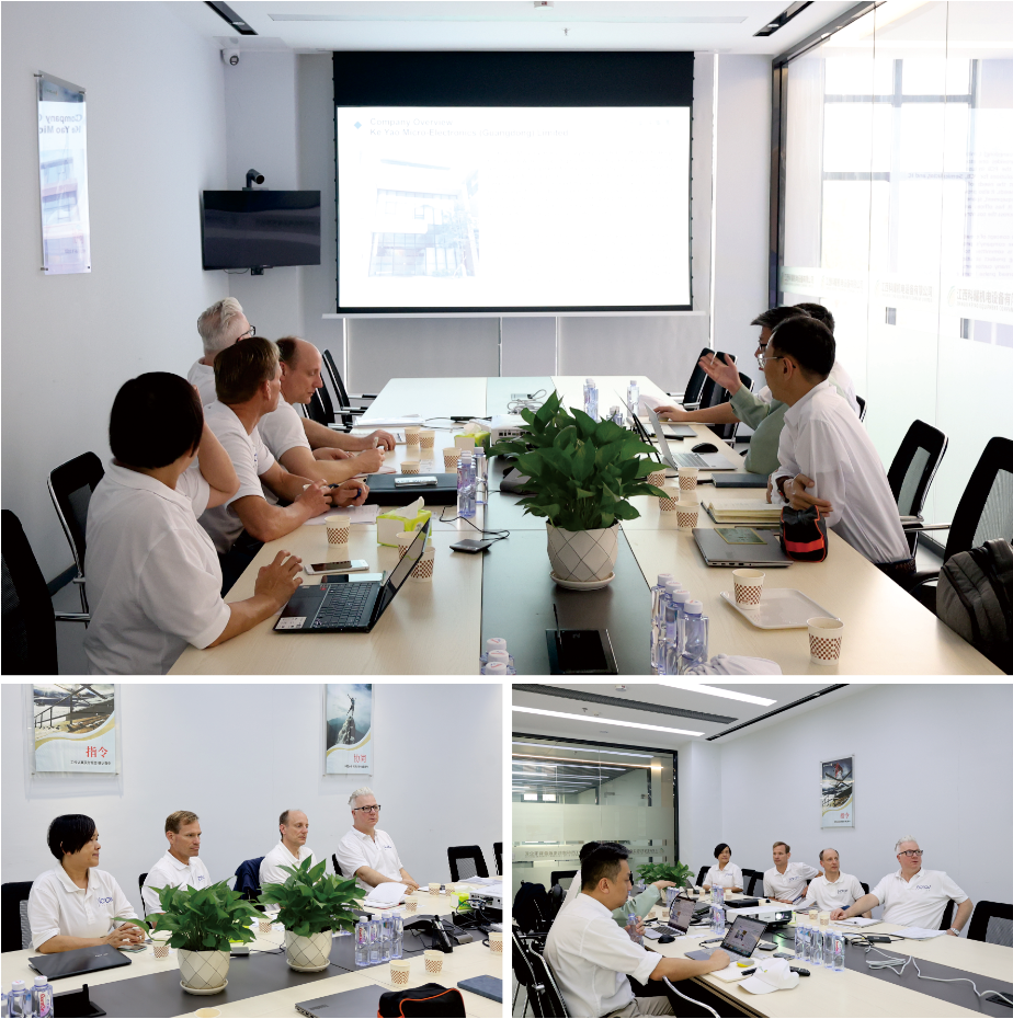 随后,一行人移步至科耀的展厅,观看了科耀的发展历程展示以及最新产品的研发演示。在展厅内,双方技术人员进行了深入的交流和探讨,就PCB行业的发展趋势、技术创新以及市场需求等方面进行了热烈的讨论,共同探讨了未来的合作方向。
