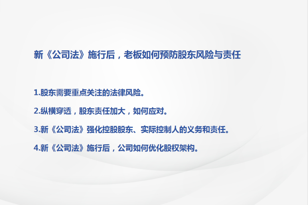 本次培训吸引了20余位来自不同行业的企业家们积极参与。培训会上,股权专家详细解读了新公司法中股东需要重点关注的法律风险,并就如何在纵横穿透的法律环境下应对股东责任加大等议题进行了深入探讨。并针对控股股东、实际控制人如何预防连带责任,以及新公司法施行后公司如何优化股权架构等热点问题,给出了实用的建议和操作策略。