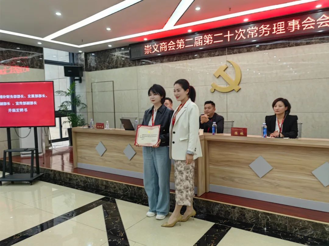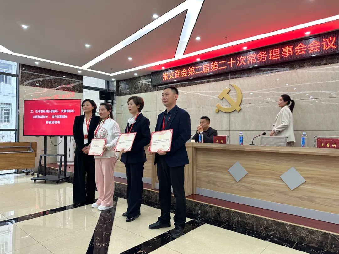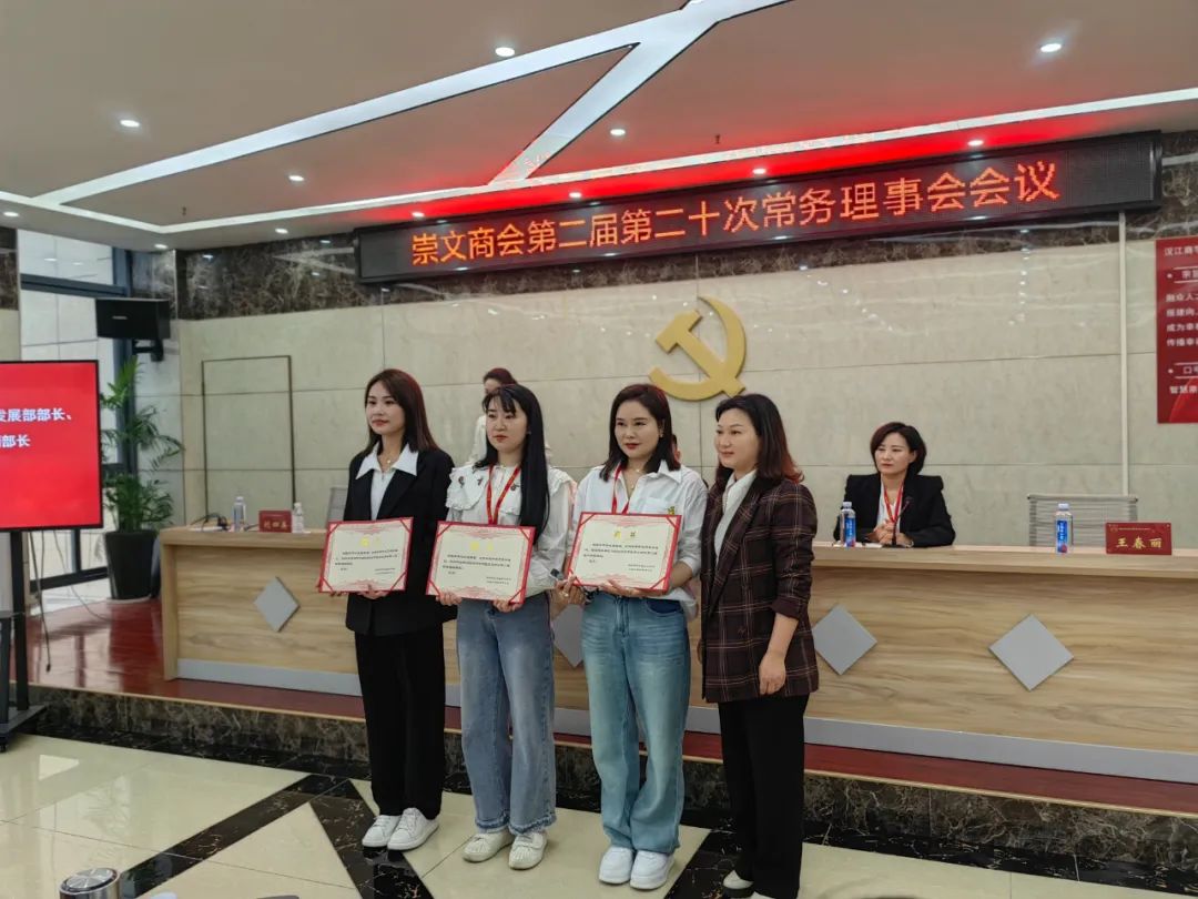 为增强商会发展活力,创新商会发展方式,全面提升各部服务质量,经过秘书处认真筛选并报商会研究,决定正式聘任:罗美玲为商会财务部部长;毛传梅为商会发展部部长;刘先喜、黄乔红为商会发展部副部长;张芮可、金娜、朱昭红为商会宣传部副部长;会上各分管副会长为他们颁发了聘书并致以热烈的祝贺。