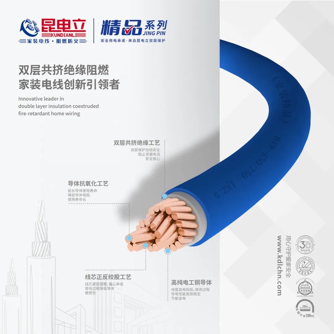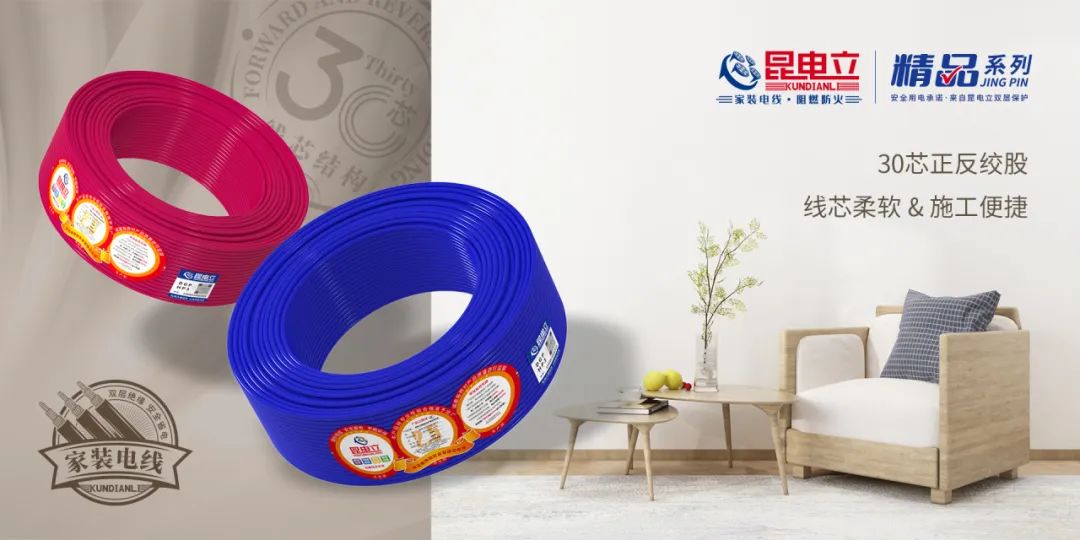 昆电立产品定位主要以家庭装修布电线系列为主,其中分为聚氯乙烯绝缘的新国标系列、家装精品系列、爱家系列和匠心系列。还有交联聚烯烃绝缘的长寿之星系列、环保系列。工程用线还有WDZ(A、B、C)N-BYJ / BYJSR等低烟无卤耐火阻燃布电线等产品。