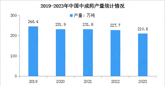 数据来源:Frost&Sullivan、中商产业研究院国家药品监督管理局于2018年在全国范围内开展了饮片质量整治工作,监管力度的加强导致了饮片加工行业规模在2018-2020年出现负增长,2017-2020年年均复合增长率为-6%。根据《中国医药工业经济运行报告》,2022年我国中药饮片加工市场规模达2332亿元,增速达13.4%,中商产业研究院分析师预测,2023年我国中药饮片加工市场规模将达2607亿元,2024年市场规模将达2764亿元。中成药是以中药材为原料,在中医药理论指导下,为了预防及治疗疾病的需要,按规定的处方和制剂工艺将其加工制成一定剂型的中药制品,是经国家药品监督管理部门批准的商品化的一类中药制剂。近年来,在医保控费、重点监控辅助用药、限输令、新药审批从严等政策影响下,我国中成药的产量整体呈下降趋势,由2019年的246.4万吨下降至2022年的227.7万吨。中商产业研究院数据库显示,2023年,我国中成药产量210.6万吨,同比下降7.5%。目前,中医药已传播到全球180多个国家和地区,在其中29个国家和地区得到法律认可,18个国家和地区将中医药纳入医疗保险范畴。受国外中成药需求变动影响,我国中成药出口量较为波动。国家统计局数据显示,2019年-2021年我国中成药出口量出现下降,2022年恢复增长,2023年小幅下降。其中,2023年我国中成药出口量12205吨,同比下降4.9%。在政策利好行业发展、居民收入持续增长和医疗保健意识不断增强、我国中药材资源丰富以及人口进一步老龄化的趋势下,中医药行业发展前景广阔。利用现代科技手段,如大数据、基因编辑等,对中药进行深入研究,开发出更具疗效的创新药物。同时,针对中医药理论体系中的一些难题,如证候规范化、疾病诊疗指南等加强研究,以推动中医药现代化进程。随着中药材需求的不断增加,野生资源已经无法满足需求。因此,需要加强中药材人工种植、养殖的研究和推广,制定科学的中药材种植、养殖规范,保证中药材的质量和可持续性。利用现代科技手段,如大数据、人工智能等,将中医药与科技深度融合,推动中医药的数字化、智能化、精细化发展。例如,利用大数据分析中医药临床数据,挖掘中医药的疗效和优势病种;利用人工智能技术,开发智能化的中医药诊疗系统等。随着国际上对中医药的认可度不断提高,中医药行业需要加强国际合作,推动中医药的国际标准化和国际化进程。例如,参与国际中医药标准的制定、推动中医药的国际教育、加强国际临床研究合作等。随着人们健康观念的转变和对中医药服务的需求增加,中医药行业需要创新服务模式,提供更加个性化、专业化的服务。例如,开展中医药健康管理服务、发展中医药特色康复服务、探索中医药与养老服务融合发展等。来源:各平台媒体信息整合
