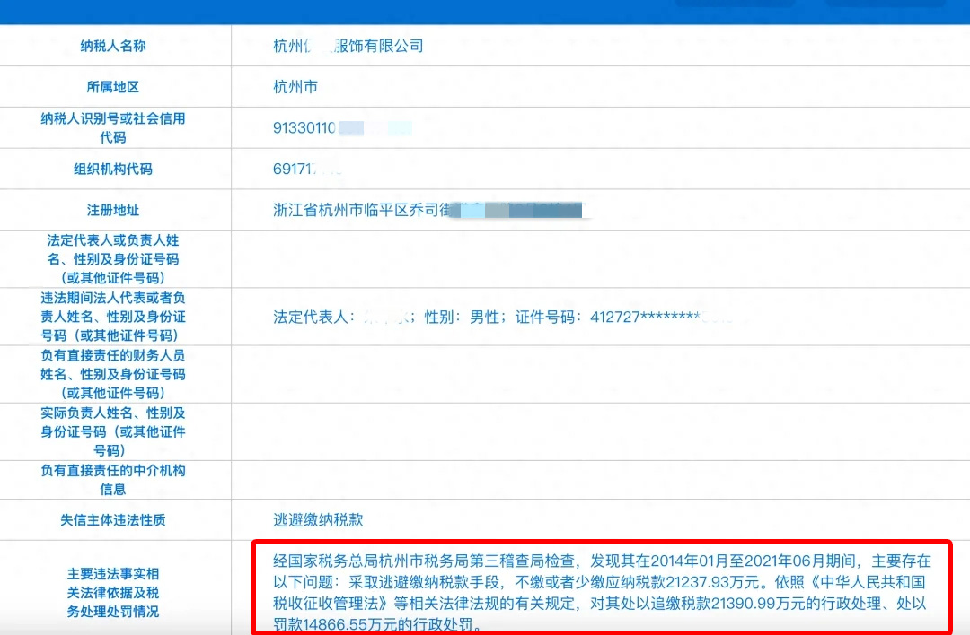 杭州服饰公司偷税被罚3.6亿!