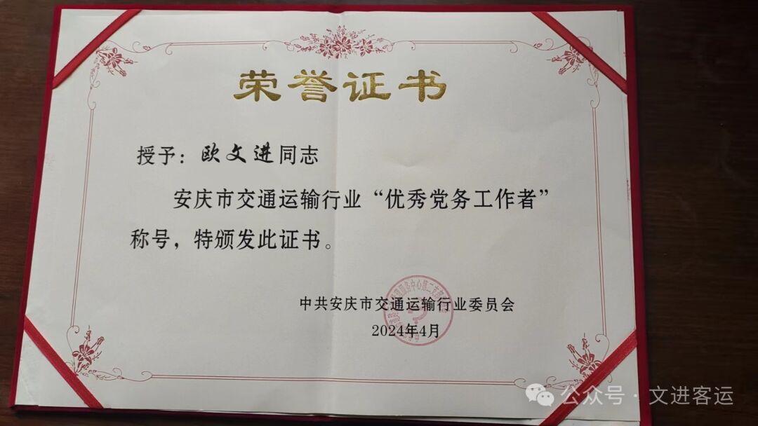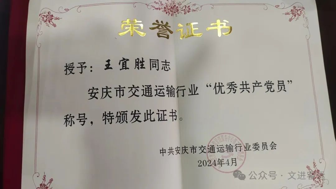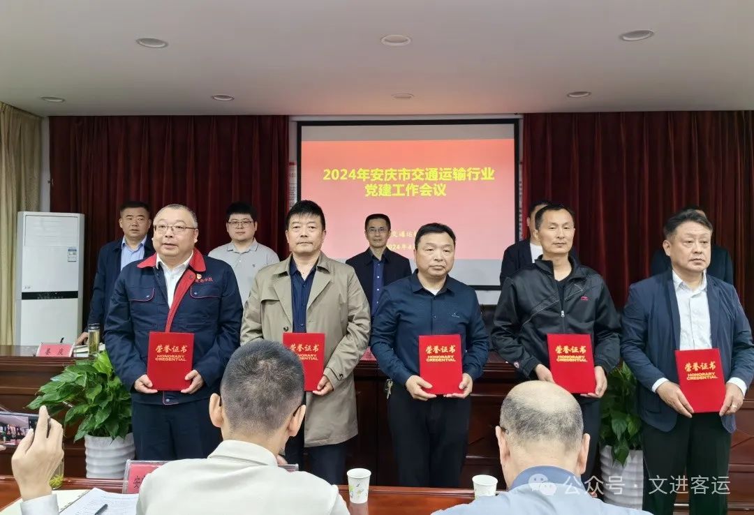 安庆市文进旅游客运有限公司支部书记欧文进同志、党员代表王宜胜同志参加市交通运输行业党建工作会议。会议聚焦传达相关文件精神,会议也同时对市交通运输行业非公企业和社会组织党建工作先进典型评选表彰。在此次表彰中文进旅游客运有限公司党员王宜胜同志获得安庆市交通运输行业“优秀共产党员”称号,党员欧文进同志获得安庆市交通运输行业“优秀党务工作者”称号。