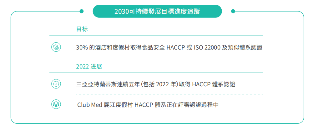 Club Med 则是在所有业务部门和所有区域都聘请了专职的健康与食品安全经理,所有食品服务人员都参与了HACCP 培训。值得注意的是,Club Med 所有度假村每两个月接受一次第三方食品安全审计。