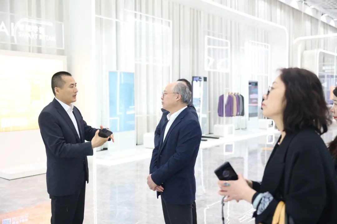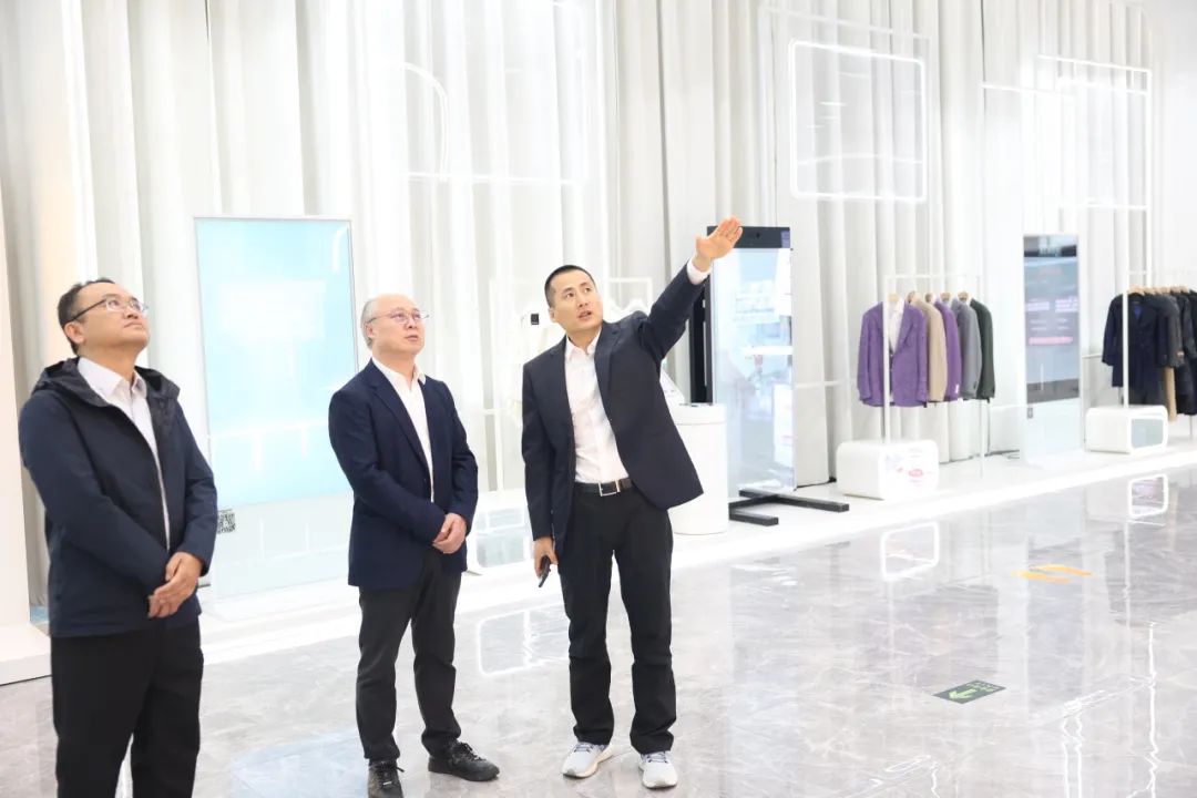 会议开始之前,中国服装科创研究院服务平台总经理 王亚涛向常州纺织服装职业技术学院党委书记 吴访升一行介绍了“服装数字化场景实验室”和“5G未来工厂实验室”。吴书记一行初步了解了服装行业在智慧零售和设计研发的数字化解决方案,以及智能仓储、智能裁剪、智能齐套管理、智能缝制、定制印绣花、智能成品仓储一站式解决方案等。