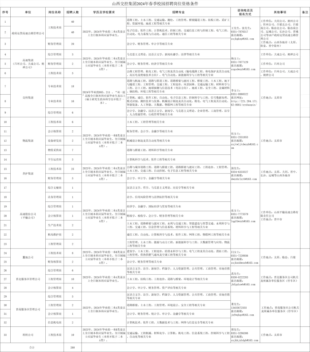 山西交控集团所属政府还贷高速公路公司和高速集团、交科集团、物流集团、养护集团、高速股份公司、置地公司、晋北服务区管理公司、晋南服务区管理公司、科转公司,共招聘员工260人。