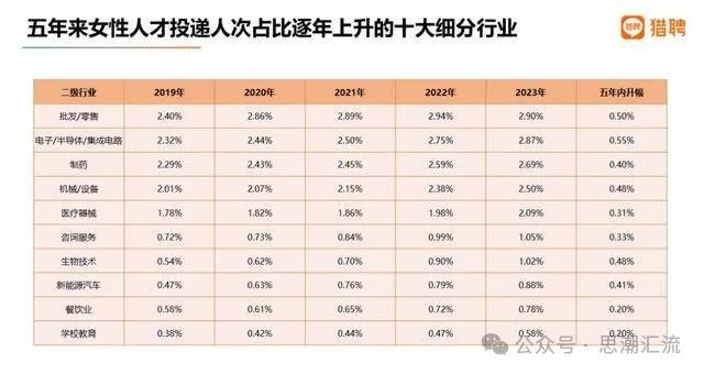 女性人才更青睐新兴行业,愿意尝试新事物。从过去五年女性投递人次占比上升的细分行业来看,投递电子/半导体/集成电路的女性人次占比增幅最为明显,从2019年的2.32%上升到2023年的2.87%,增加了0.55个百分点;其次是批发/零售,从2019年的2.40%上升到2023年的2.90%,增加了0.5个百分点。