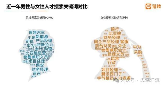 女性在求职时更关注工作福利。从近一年来男女求职者搜索关键词TOP50的对比来看,在企业类型方面,男性更关注国内企业,尤其是车企,而女性更倾向于外企。女性多追求生活和工作的平衡,而外企在这方面往往做得更好。从具体职业来看,男性更倾向于工程师等技术类工种,而女性则更感兴趣于教师等感性工作。此外,女性更加关注工作福利,她们的搜索词TOP50中出现了“双休”。通过猎聘“她时代”直播间女性观众的互动,发现女性更加关注的企业福利包括女性专属的体检项目、额外的生育保险以及相关的假期,有部分女性希望能够带孩子上班。