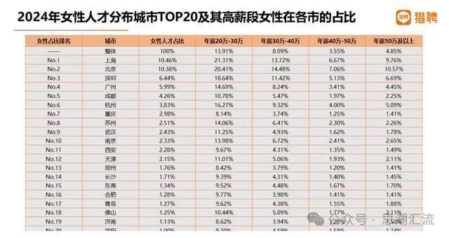 就2024年1-2月份女性人才占比最高的20个城市来看,北京、上海、深圳、杭州、广州年薪超过20万元的女性占比均超过30%,位居前五。