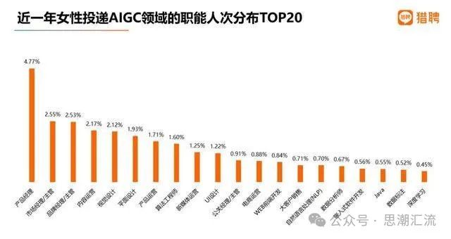 投递机械/设备和生物技术的女性投递人才占比增幅并列第三,这五年间均增加了0.48个百分点;新能源汽车和制药位列第四和第五,分别增加了0.41和0.4个百分点。批发/零售和机械/设备属于相对传统的行业,前者能够发挥女性对市场和价格敏感的优势,后者则属于制造业的核心分支,其发展稳健向好,迎合了部分女性对工作安全感的需求。值得注意的是,越来越多的女性对新兴行业,特别是集成电路、生物技术和新能源汽车等新质生产力代表性行业表现出更浓厚的兴趣,可见女性人才具备与时俱进的精神,敢于尝试新事物。
